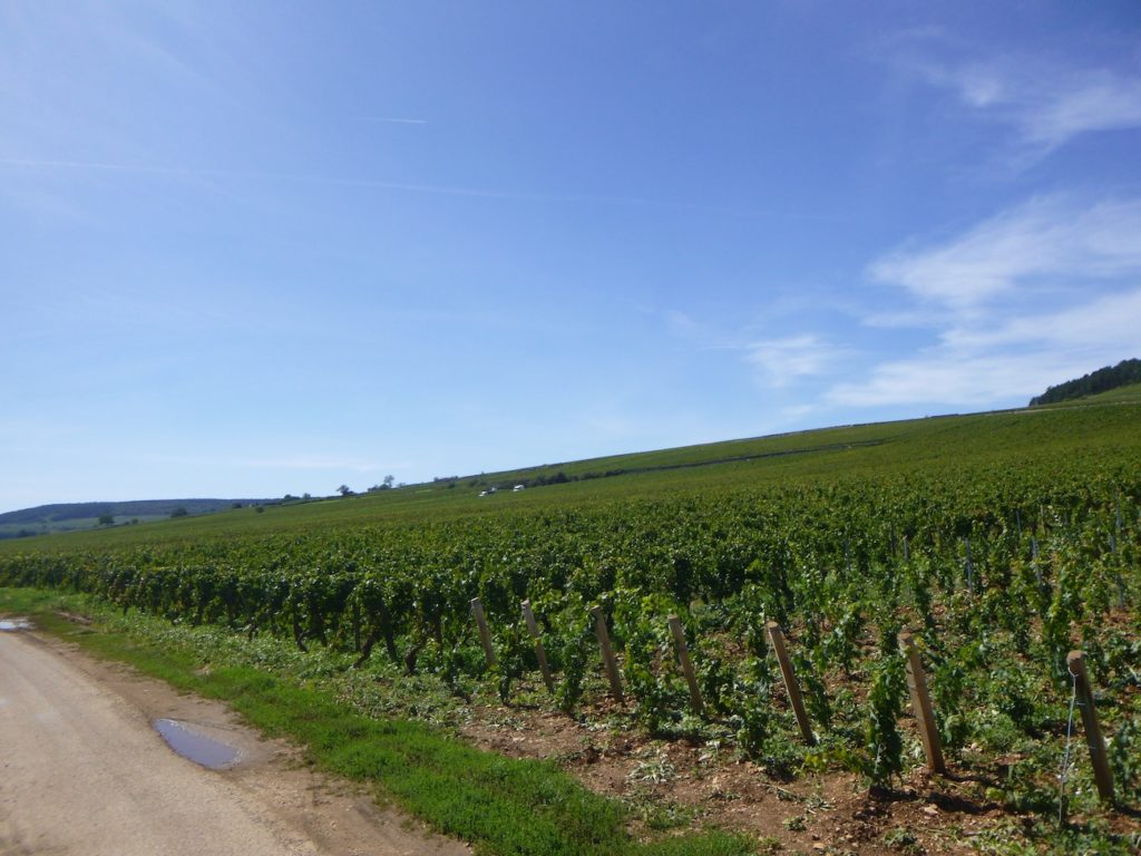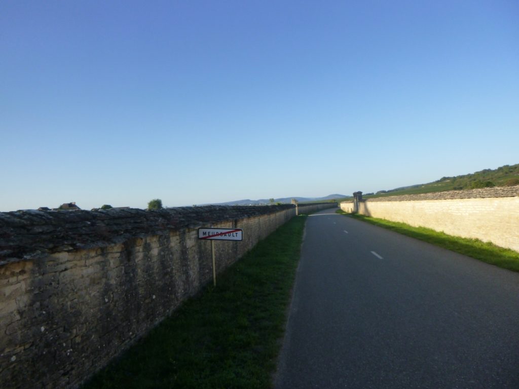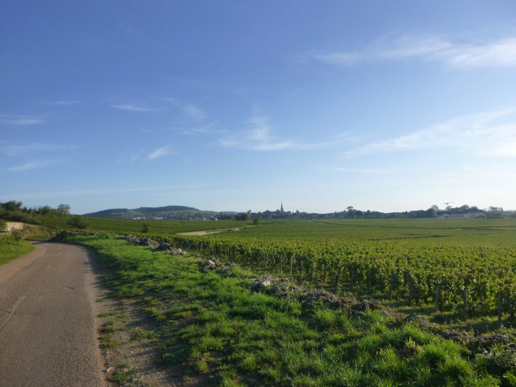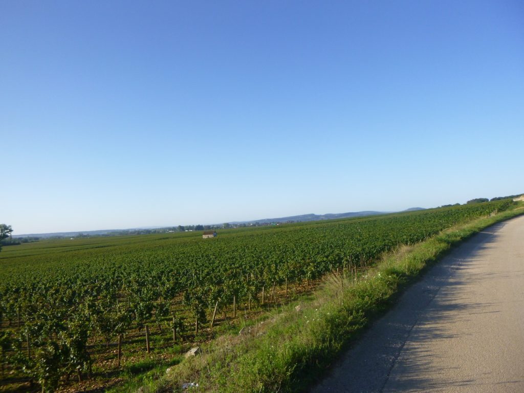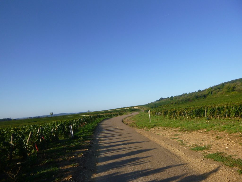 | Dès lors, c’est une longue traversée en ligne droite qui s’offre : près de deux kilomètres sans effort, à plat, entre les ceps parfaitement alignés. Le regard, libéré de la pente, s’élance vers l’horizon. Là-bas, dans une perspective toujours fuyante, se dresse le clocher élancé de Meursault. L’attente se fait désir, car le village paraît reculer au fur et à mesure qu’on avance. |