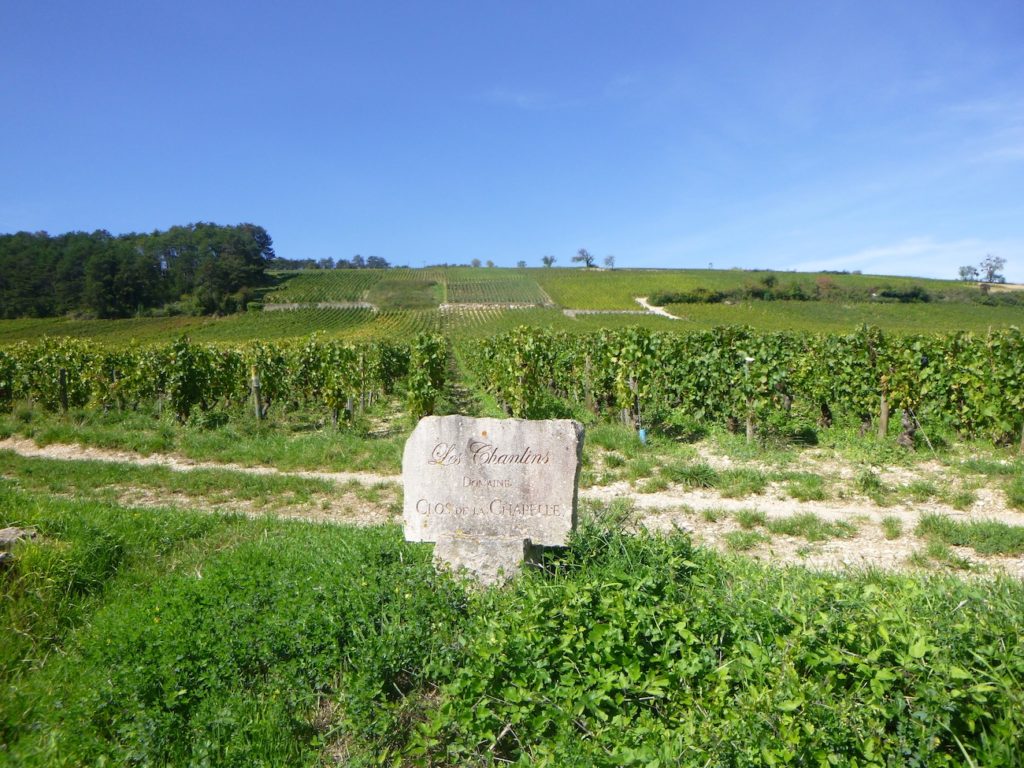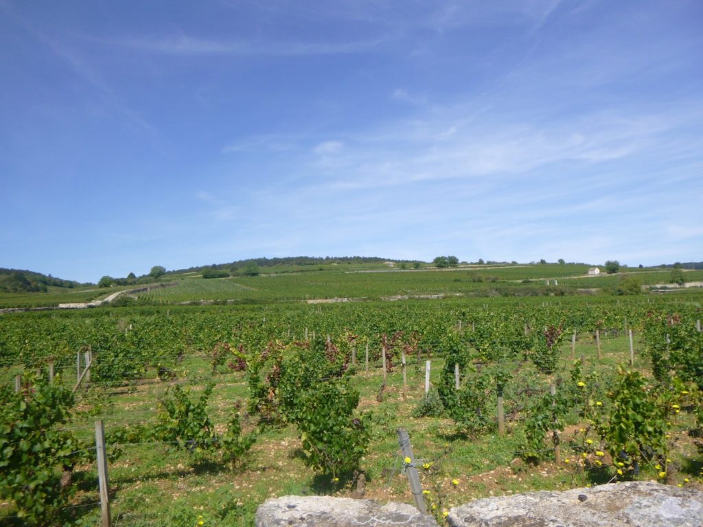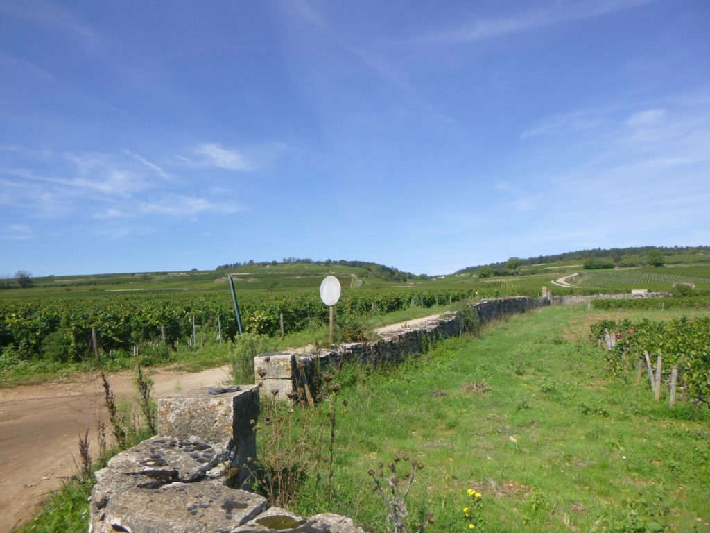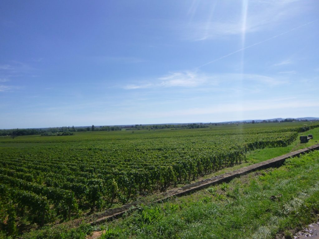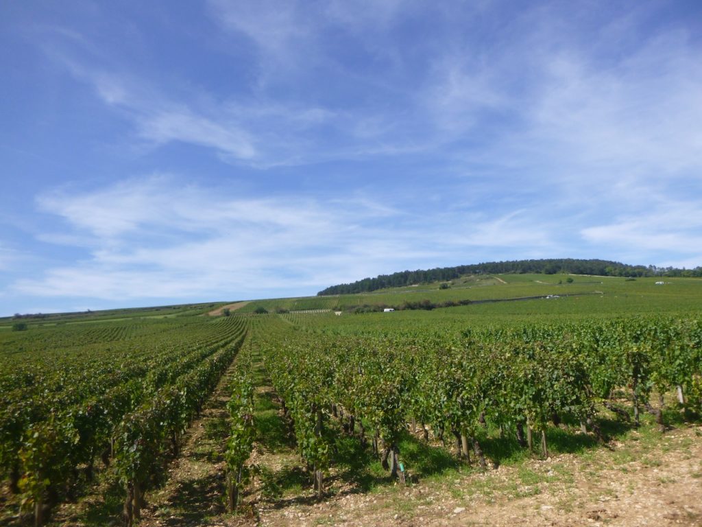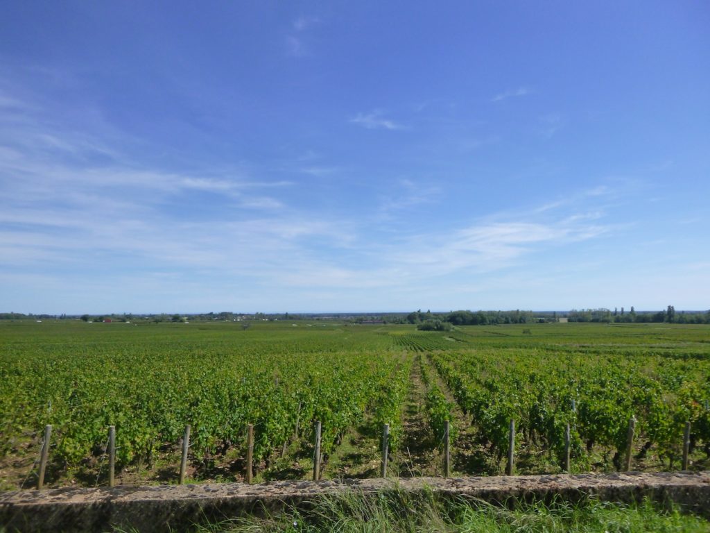 | Dès lors, c’est une longue traversée en ligne droite qui s’offre : près de deux kilomètres sans effort, à plat, entre les ceps parfaitement alignés. Le regard, libéré de la pente, s’élance vers l’horizon. Là-bas, dans une perspective toujours fuyante, se dresse le clocher élancé de Meursault. L’attente se fait désir, car le village paraît reculer au fur et à mesure qu’on avance. |