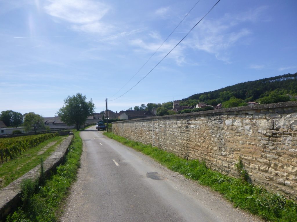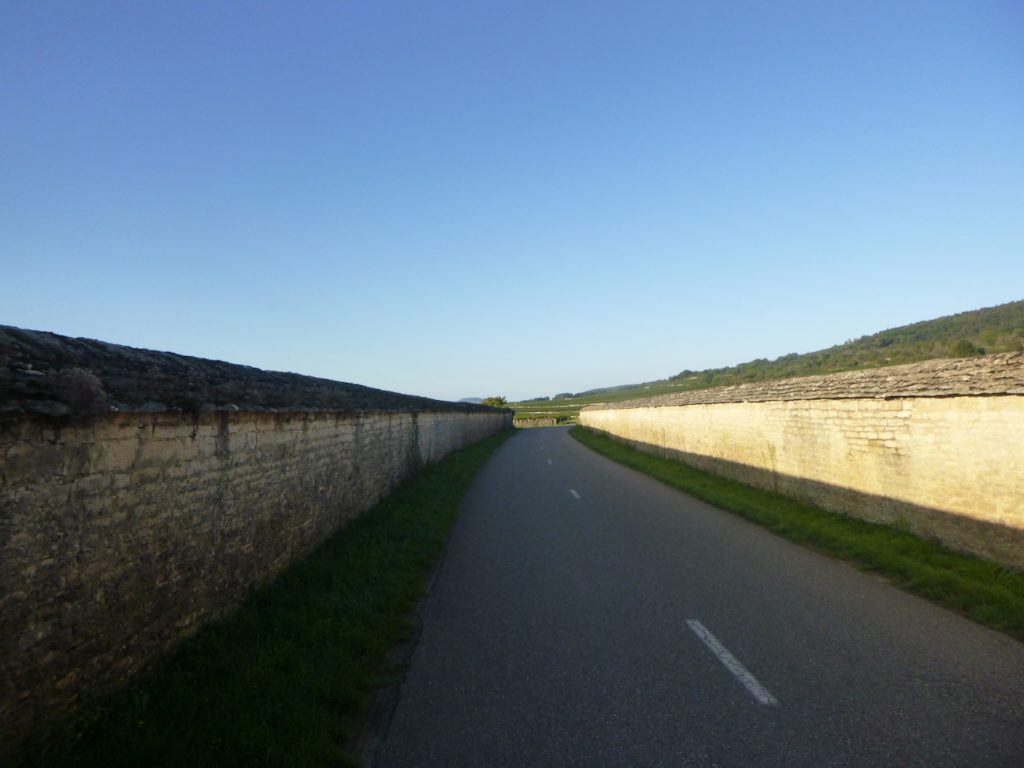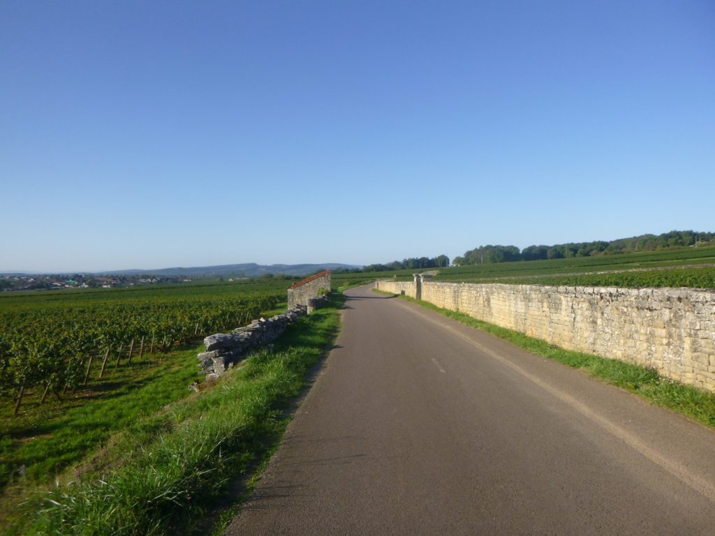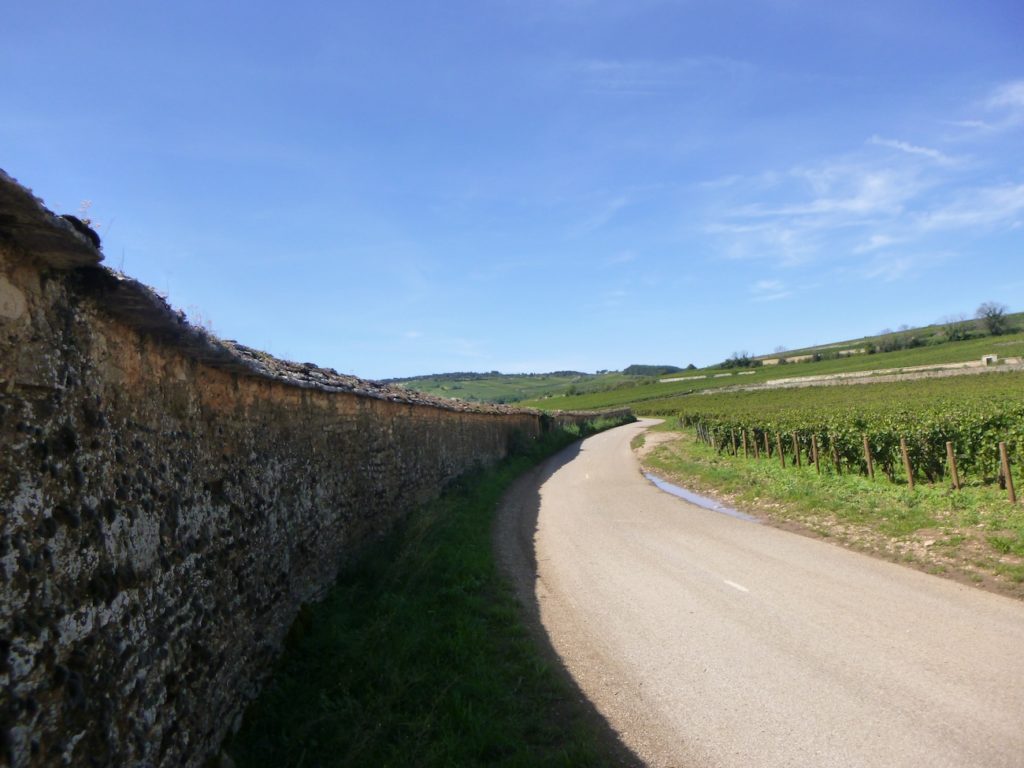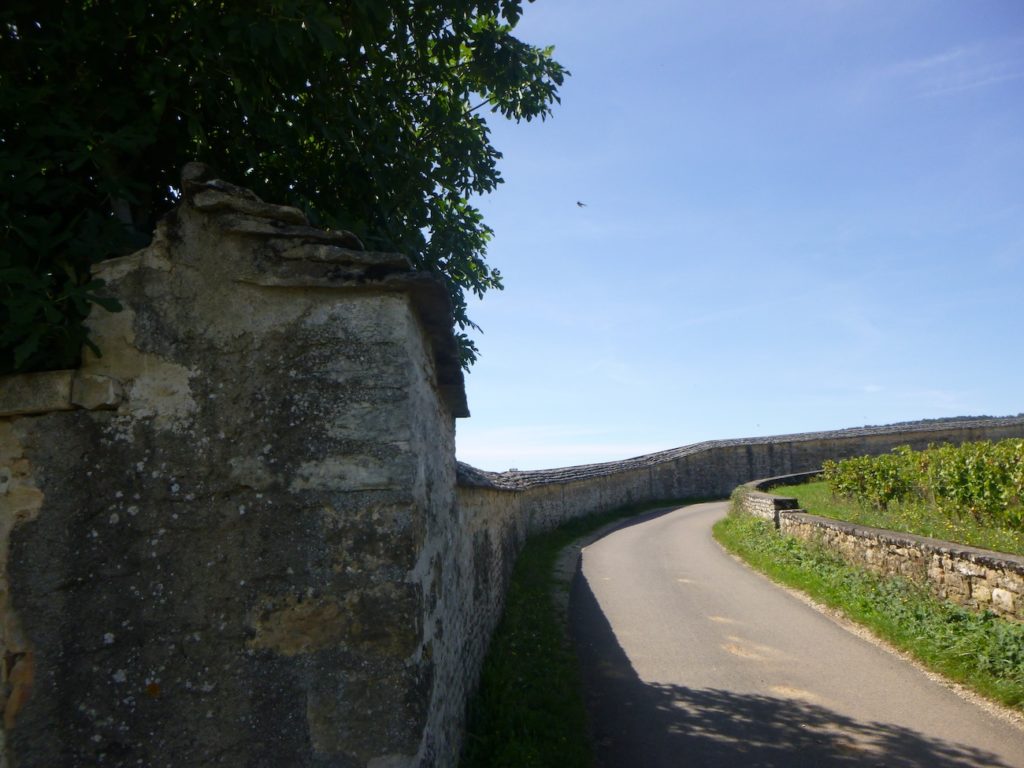 | La route se met alors à serpenter en quelques lacets gracieux, longeant un imposant mur de pierre. Derrière ses murs, on devine l’ombre d’un domaine prestigieux, peut-être l’un de ces sanctuaires où s’élaborent des crus qui font la gloire de la Bourgogne. |
