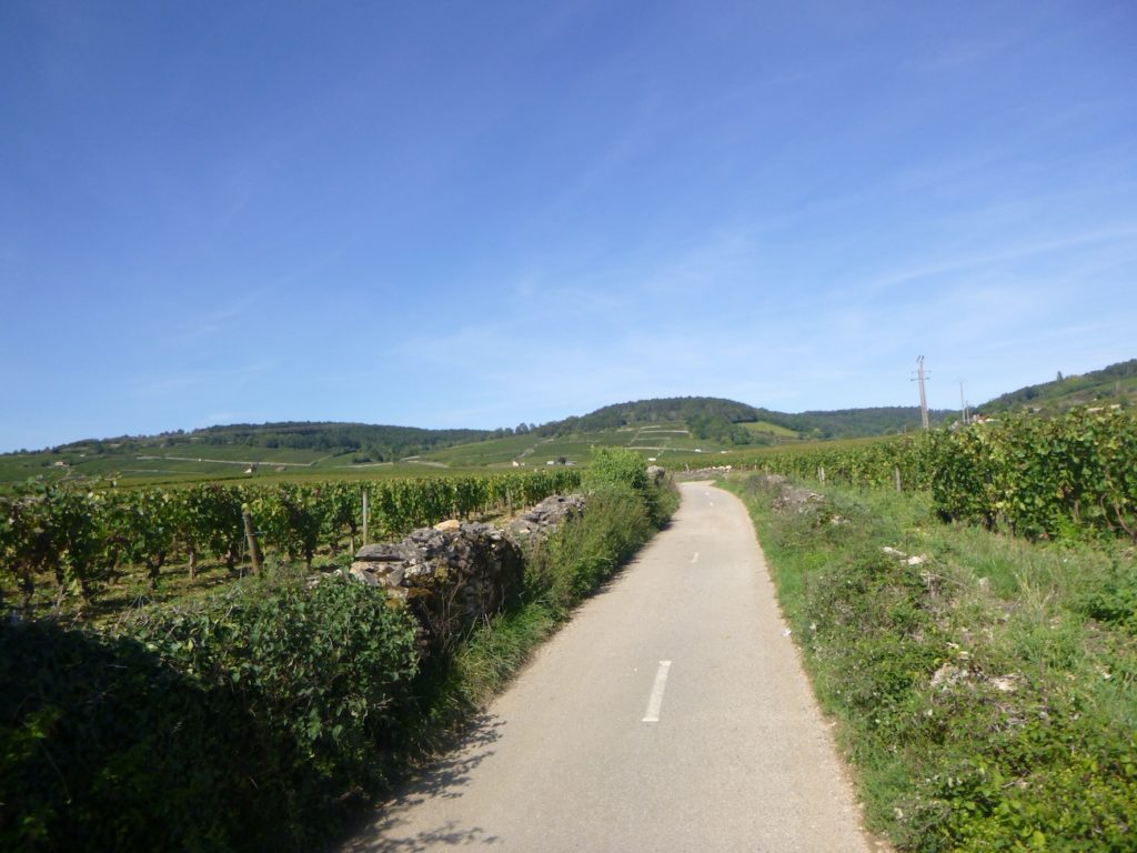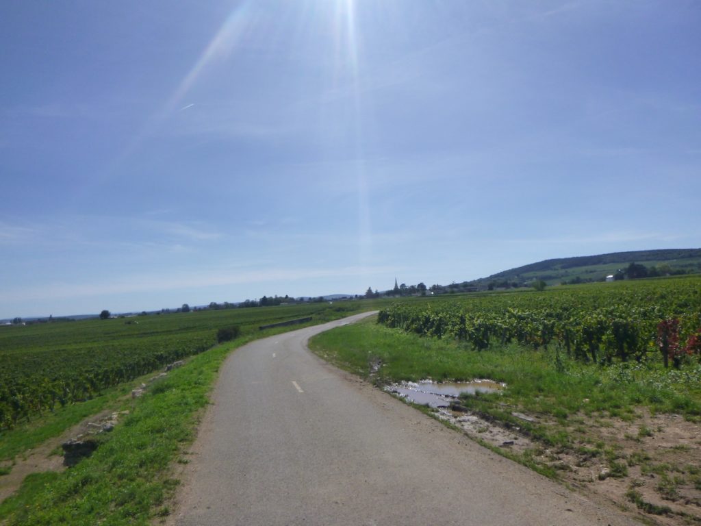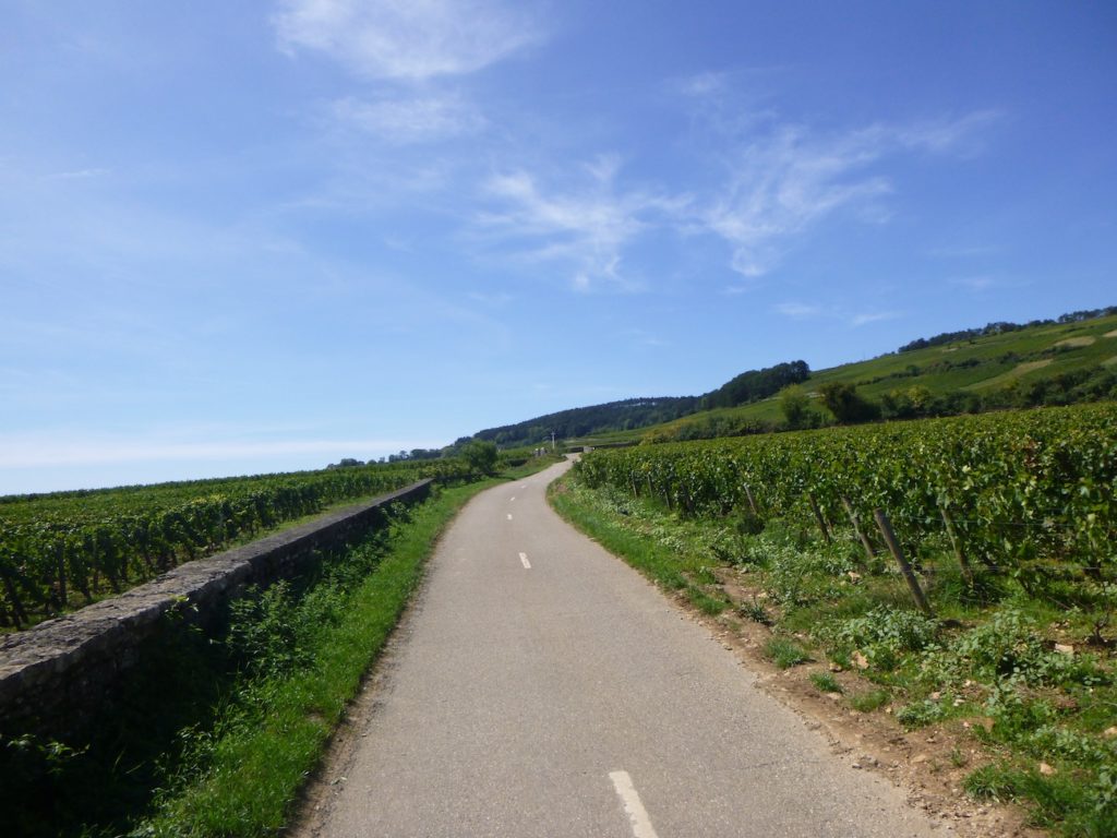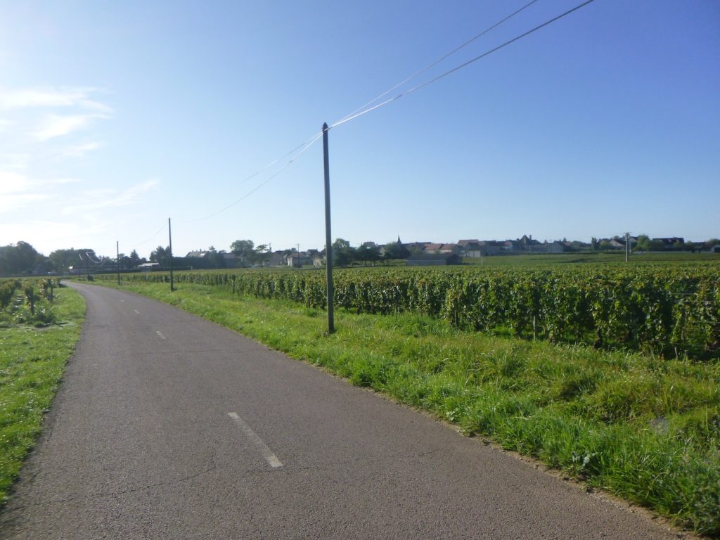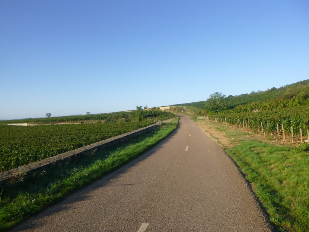 | Plus loin, la piste cyclable s’oriente vers une route plus large, qui déroule son ruban en direction de Santenay. |