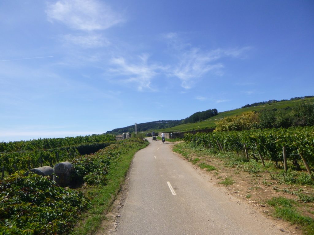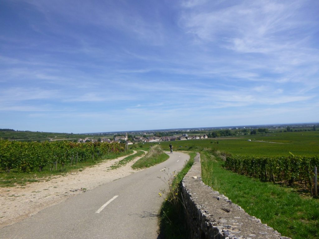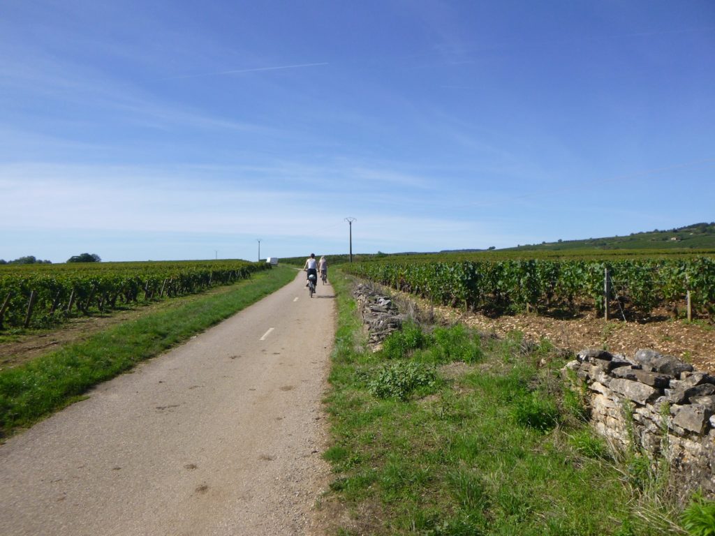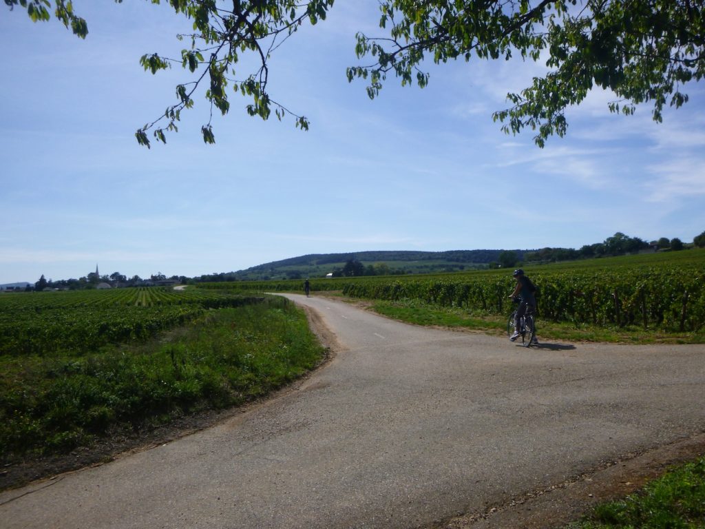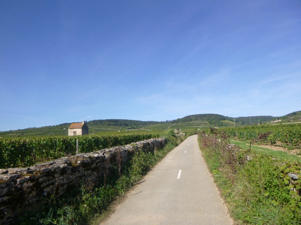 | Plus loin, la piste cyclable s’oriente vers une route plus large, qui déroule son ruban en direction de Santenay. |