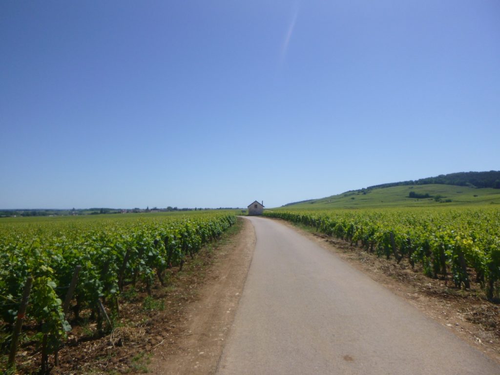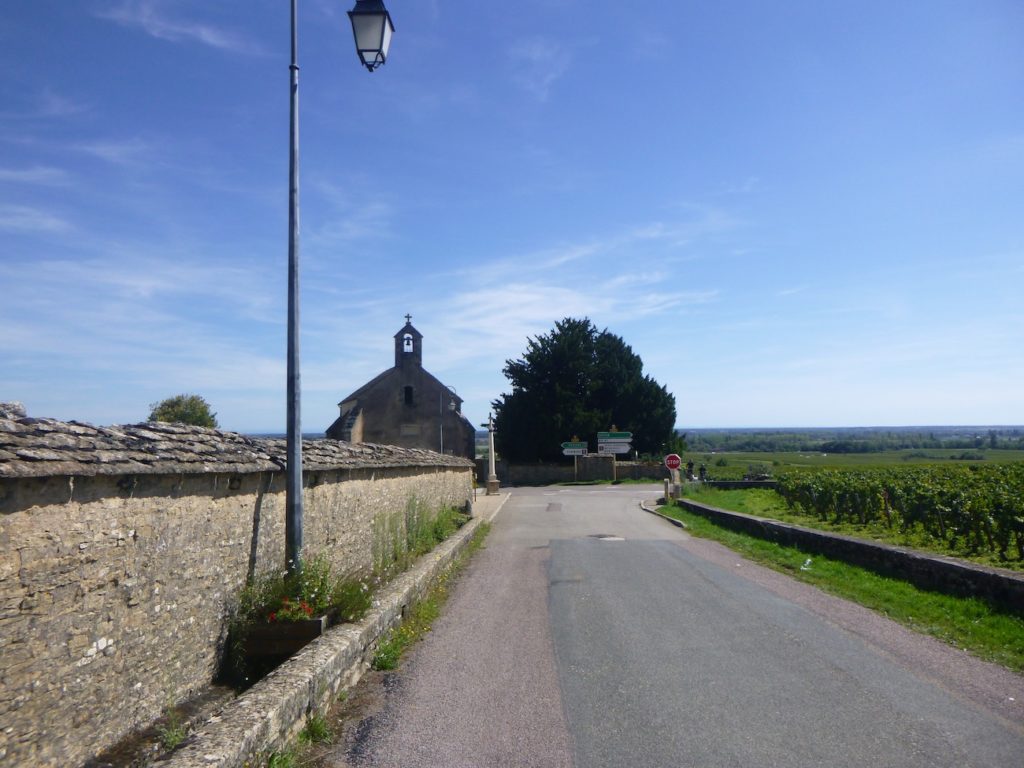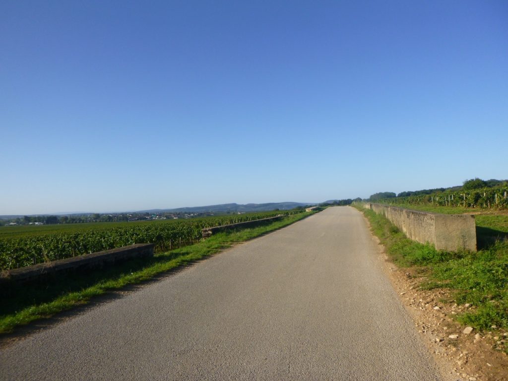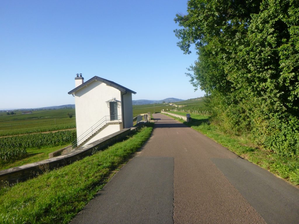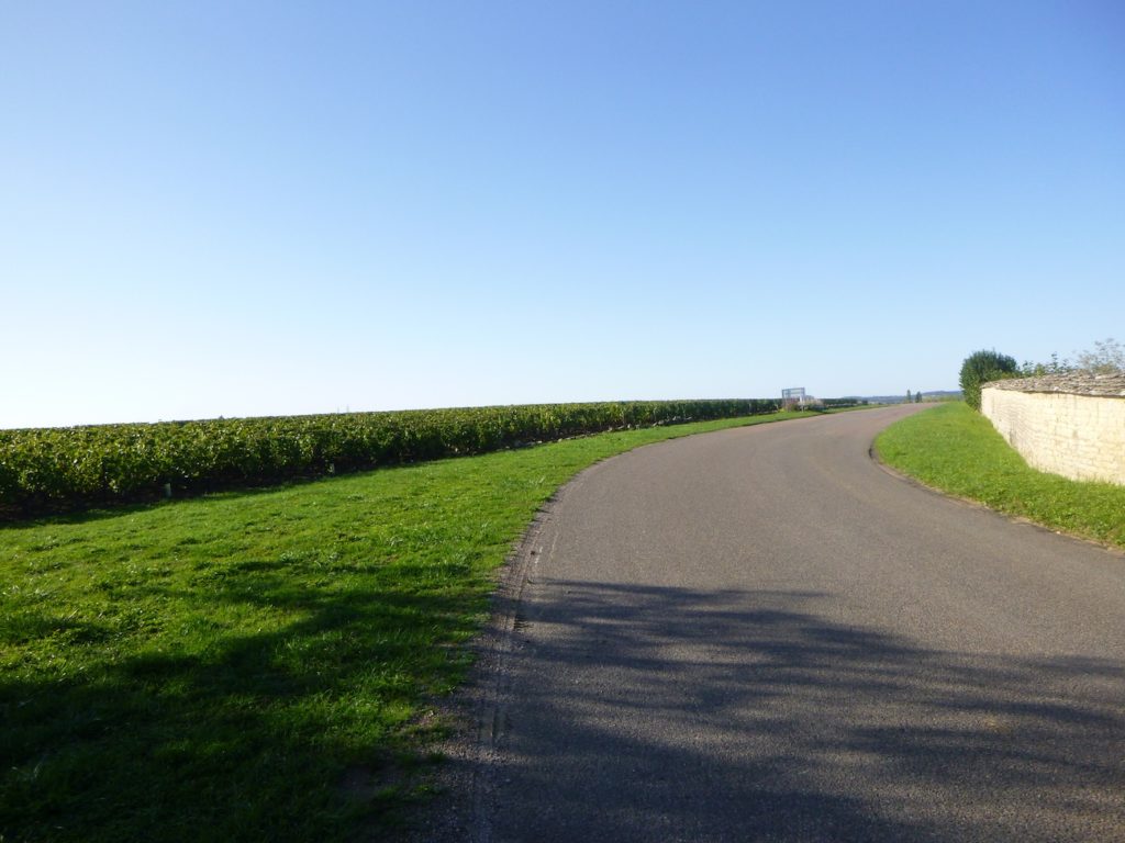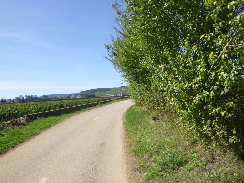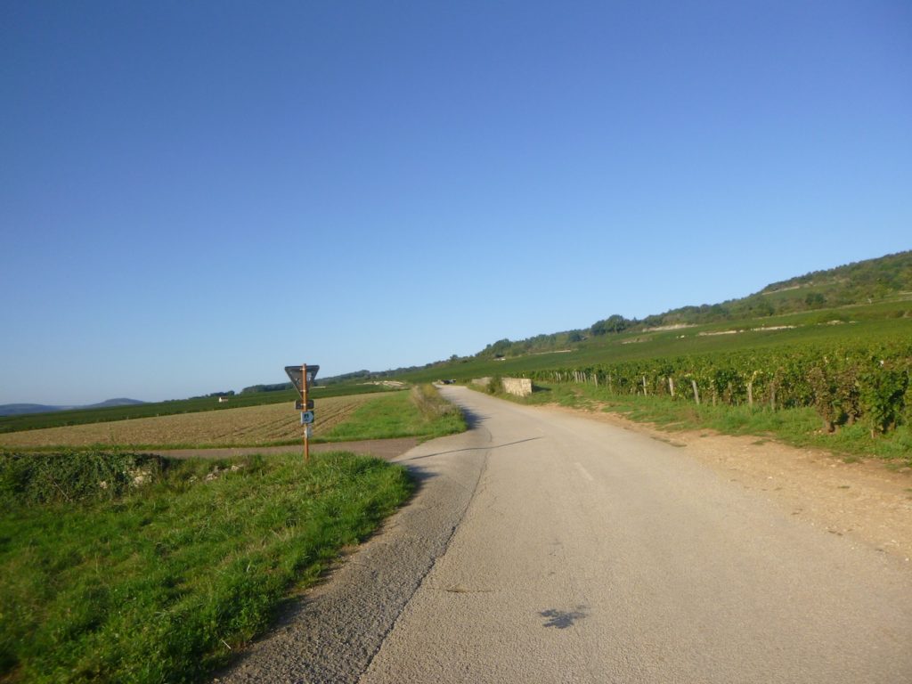 | De l’autre côté de la chapelle, une route s’amorce en descente, avant de se dérouler à nouveau au cœur du vignoble. La route, paisible, redonne la pleine mesure des paysages viticoles bourguignons. |