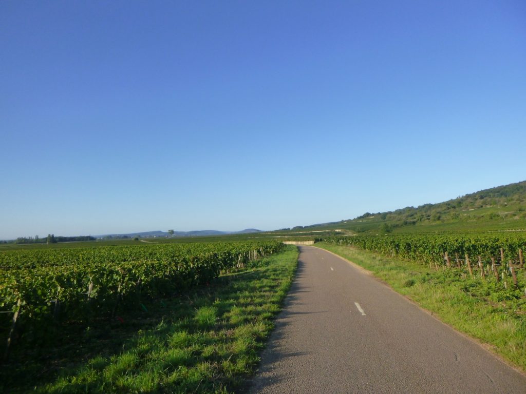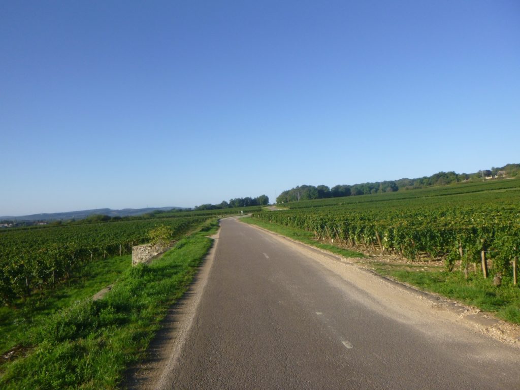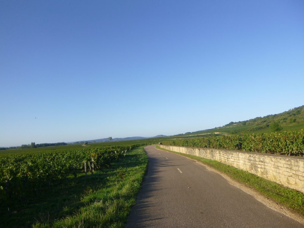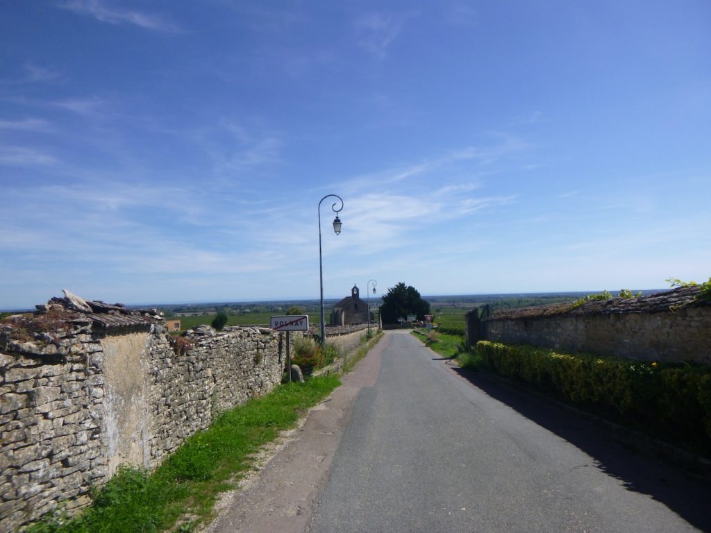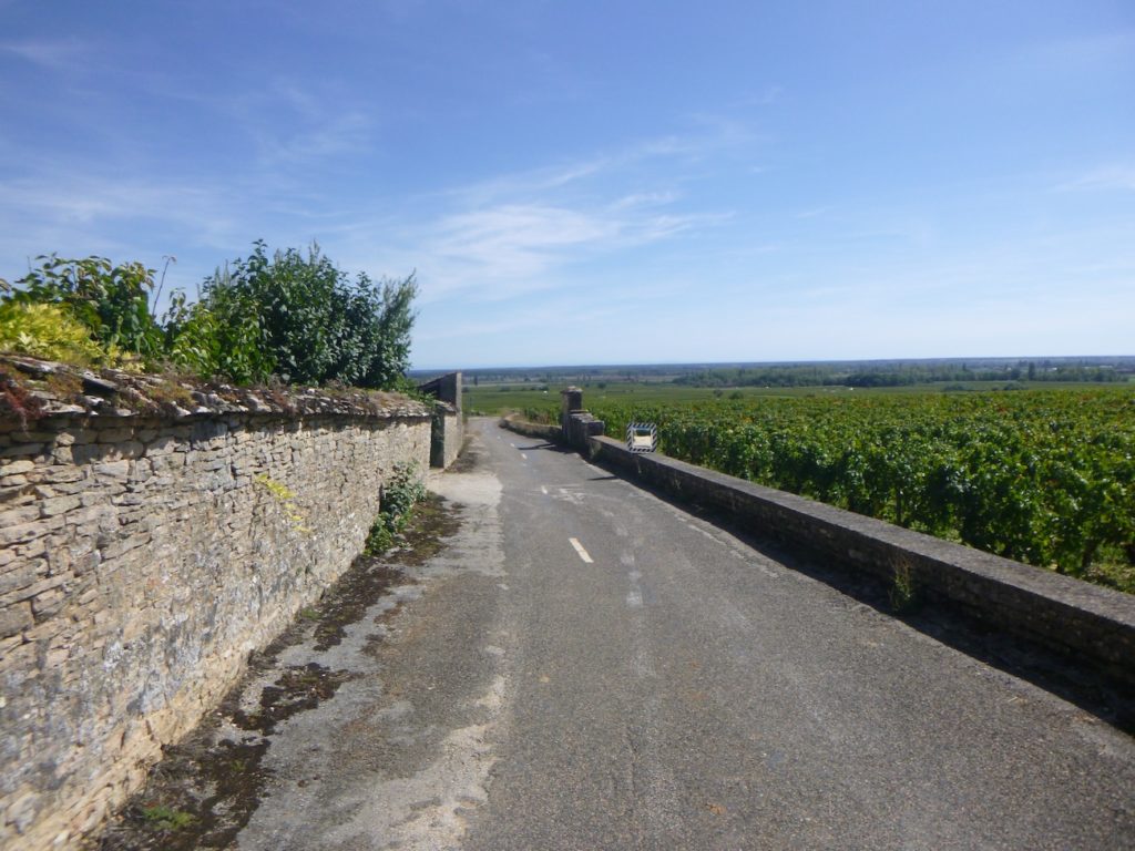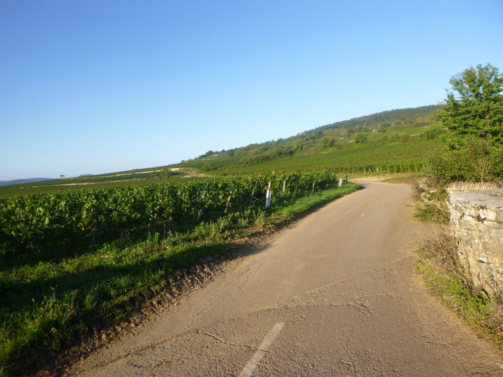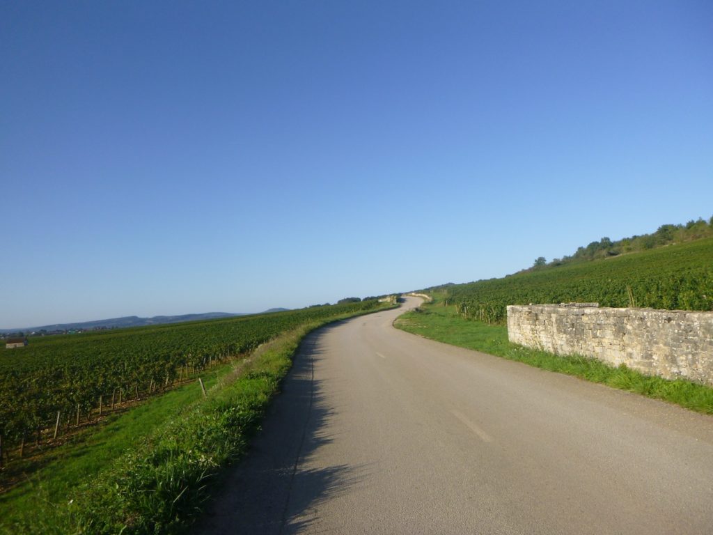 | De l’autre côté de la chapelle, une route s’amorce en descente, avant de se dérouler à nouveau au cœur du vignoble. La route, paisible, redonne la pleine mesure des paysages viticoles bourguignons. |