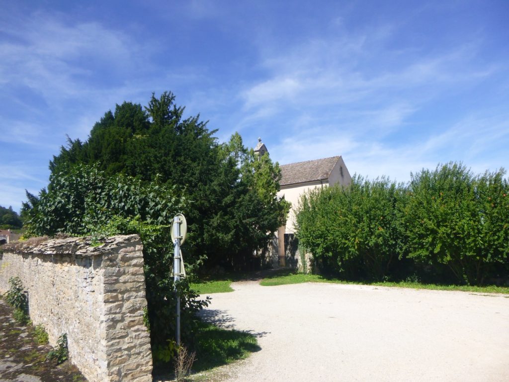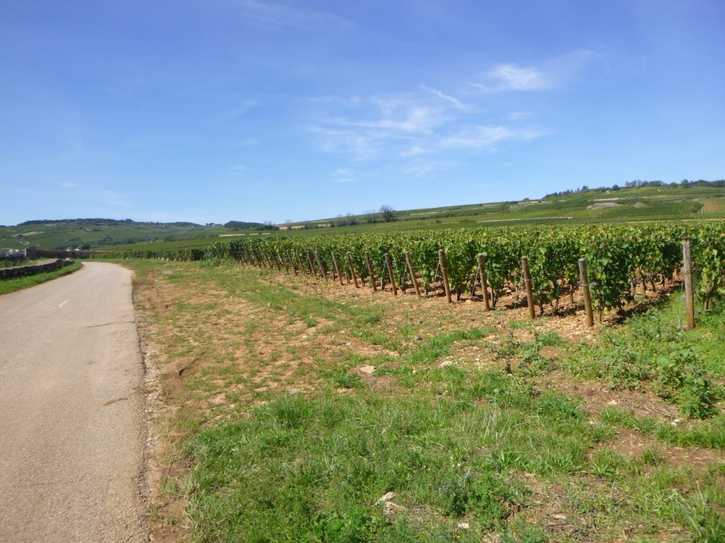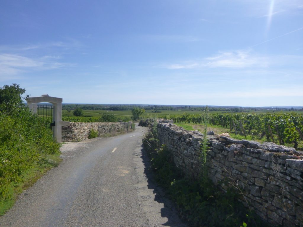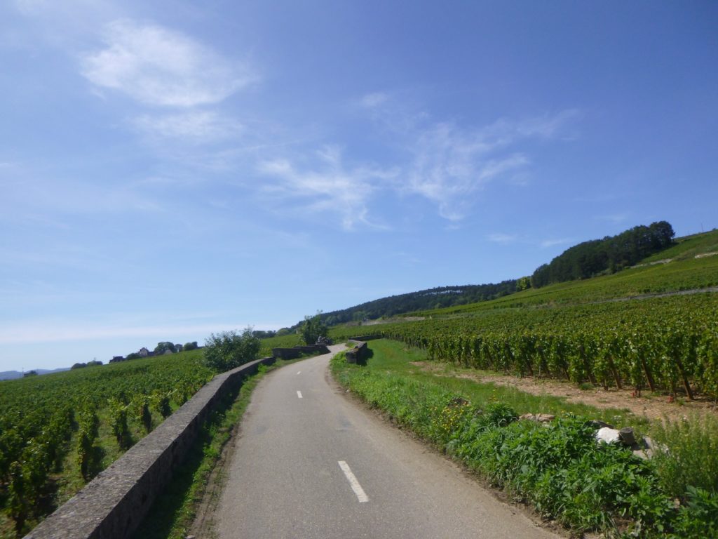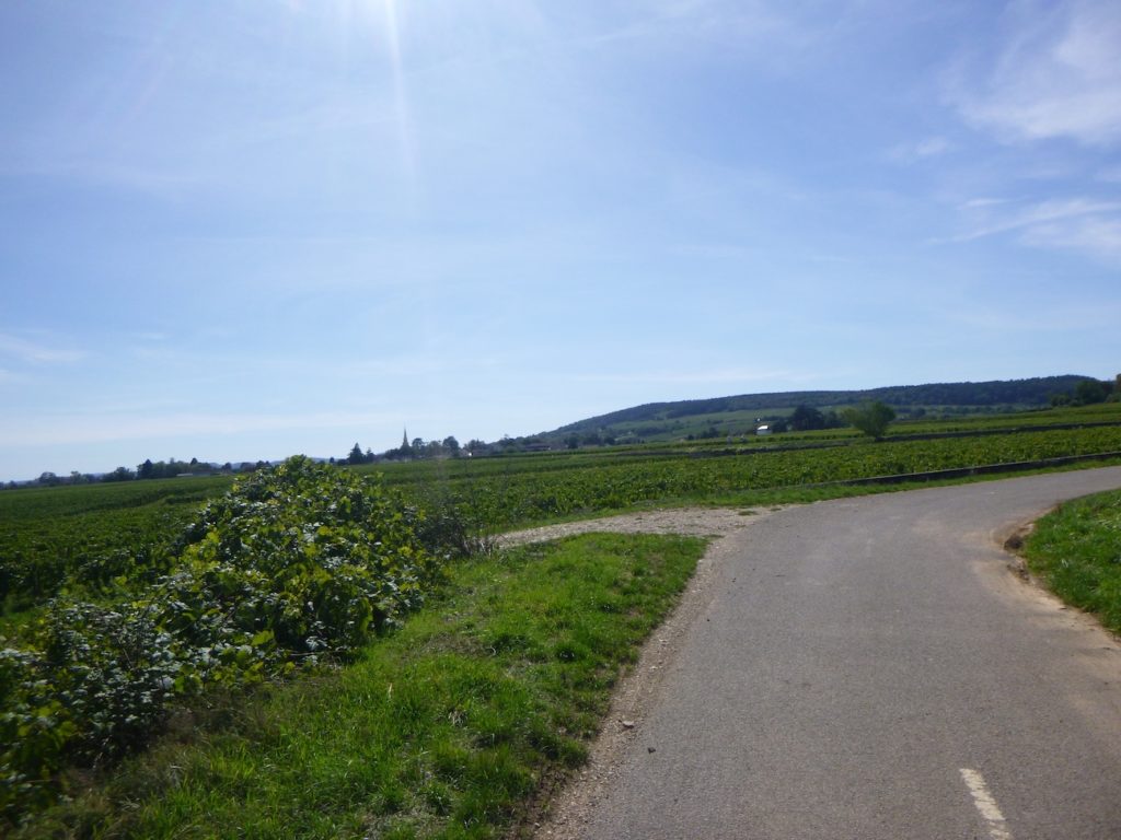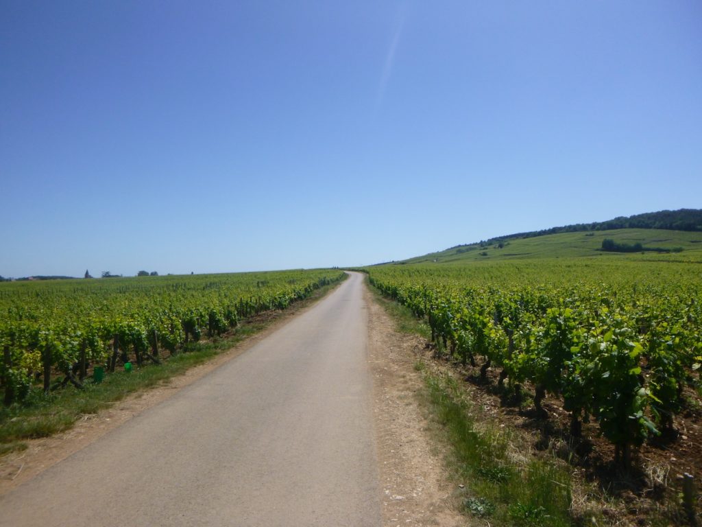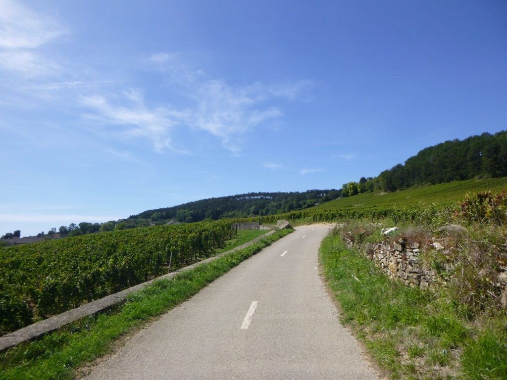 | De l’autre côté de la chapelle, une route s’amorce en descente, avant de se dérouler à nouveau au cœur du vignoble. La route, paisible, redonne la pleine mesure des paysages viticoles bourguignons. |