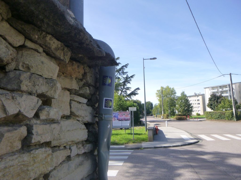 | Sur cette route, qui descend doucement vers des lotissements plus récents, vous retrouverez une indication rassurante du Chemin de Compostelle, rappel que vous marchez toujours sur une voie de pèlerinage, humble mais chargée de symboles. |