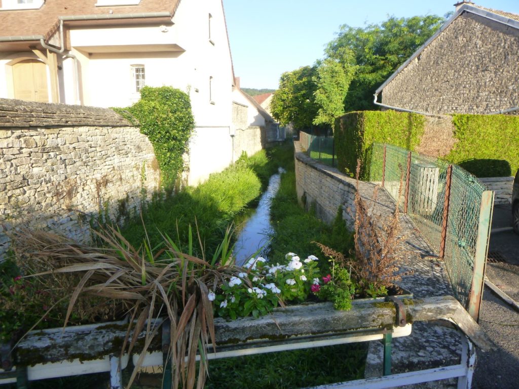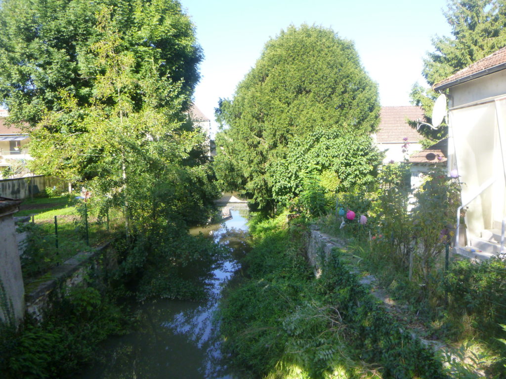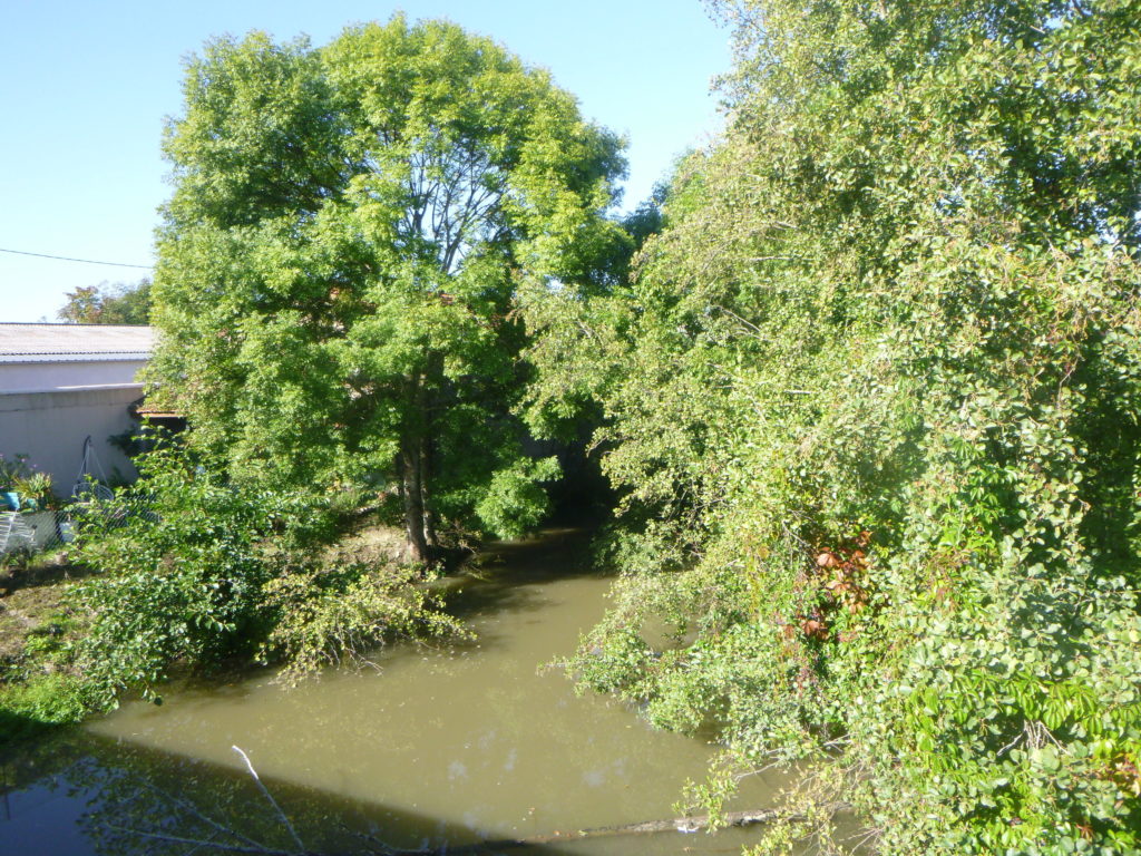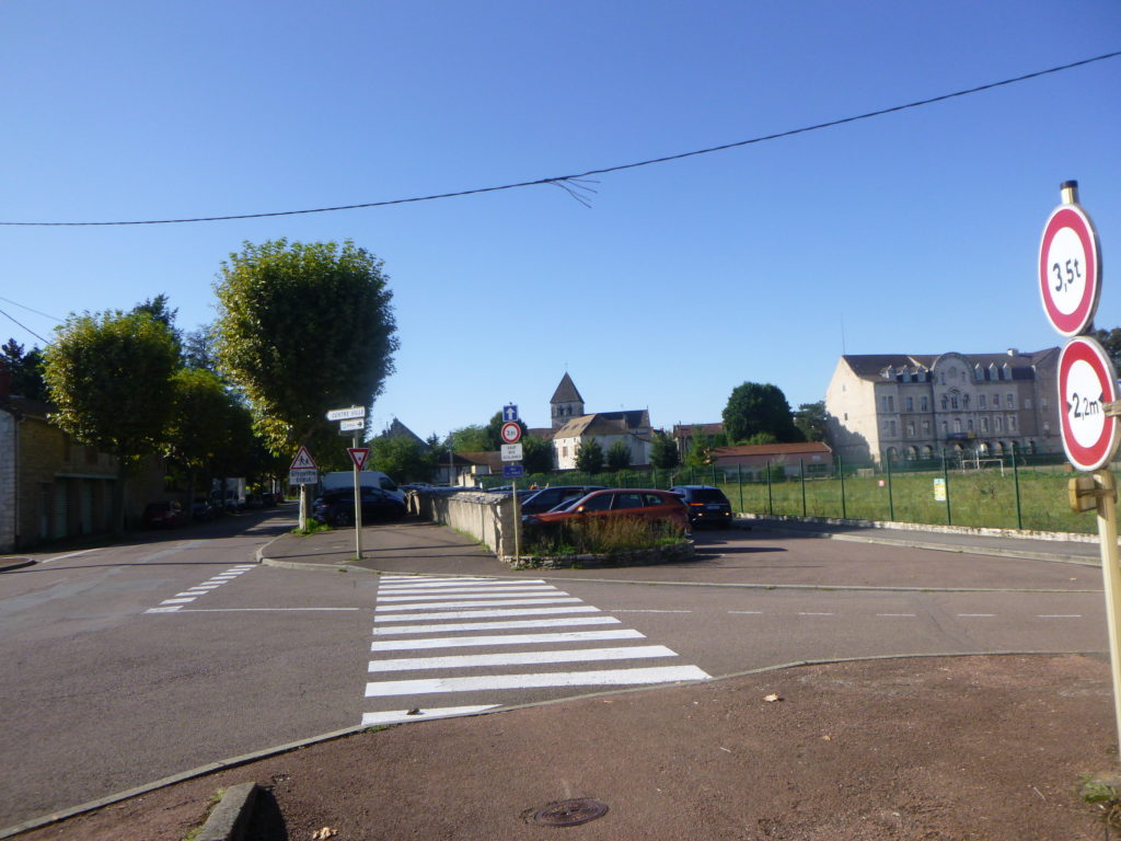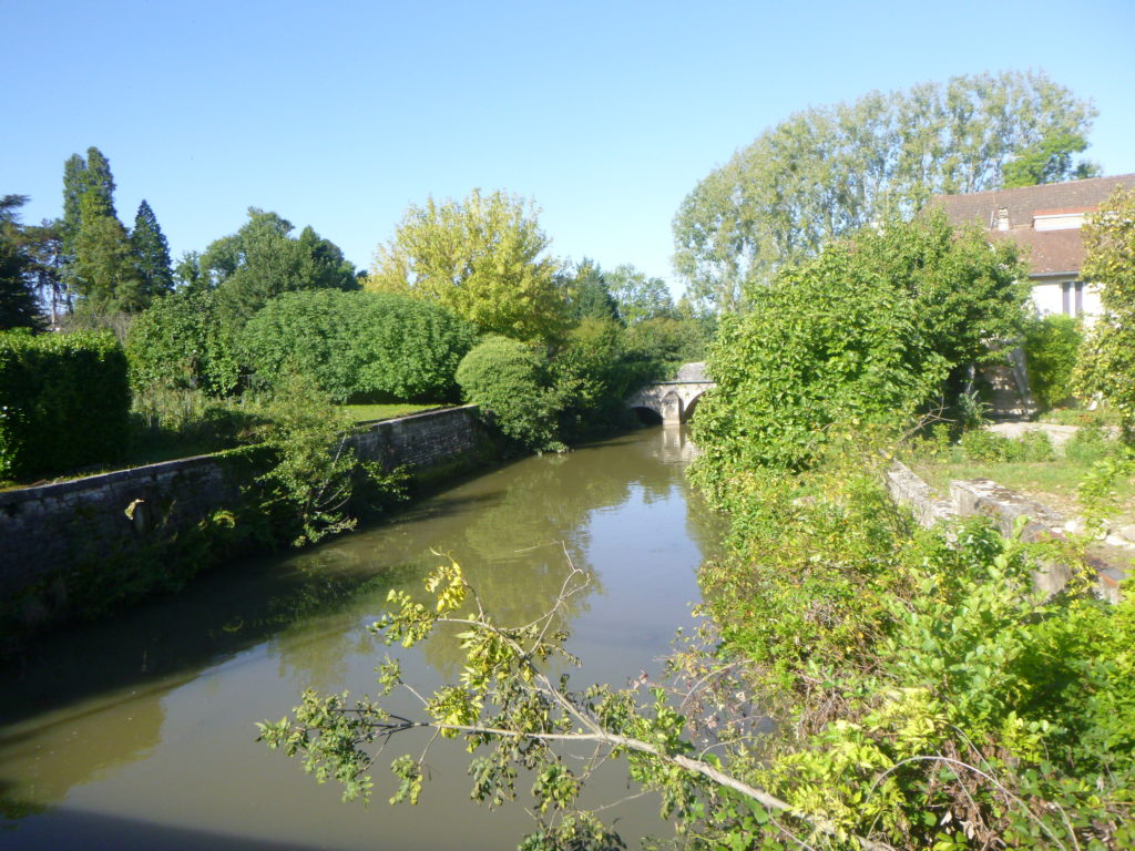 | À l’entrée de la ville, la route franchit la Dheune, ce petit cours d’eau aux eaux souvent troubles, qui disparaît par instants dans l’enchevêtrement des arbustes et des saules penchés sur son lit. |