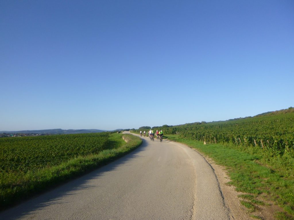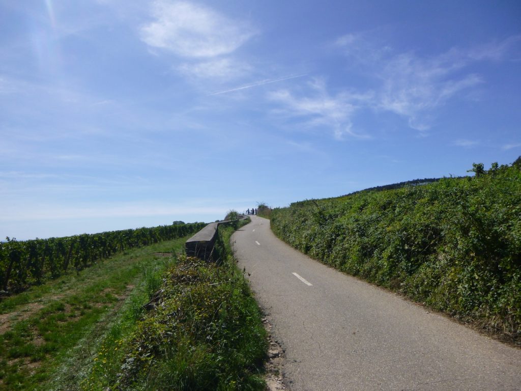 | La route continue de s’élever légèrement, serpentant entre les rangs de ceps. À certains moments, le pas du marcheur épouse la cadence des cyclistes, silhouettes filantes qui partagent l’effort de la pente et rappellent que ce territoire appartient autant à la lenteur contemplative qu’à la vitesse sportive. |