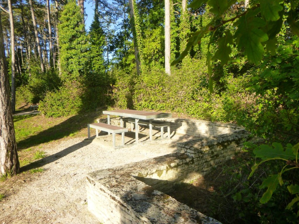 | À l’entrée du village, sur une petite éminence, une place de pique-nique a été aménagée. Oasis de repos, elle offre tables et ombre légère, comme pour inviter le pèlerin à reprendre souffle avant d’aller plus avant dans la découverte. |