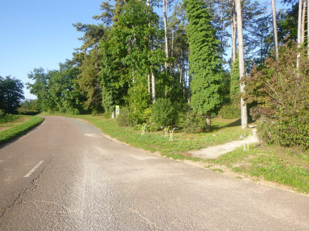 | La route y parvient rapidement. Un parc à vélos et des tables de pique-nique attendent les voyageurs sous l’ombre bienveillante des arbres. Cet endroit douillet invite à la pause, à laisser reposer les jambes fatiguées et à savourer un instant de répit. |