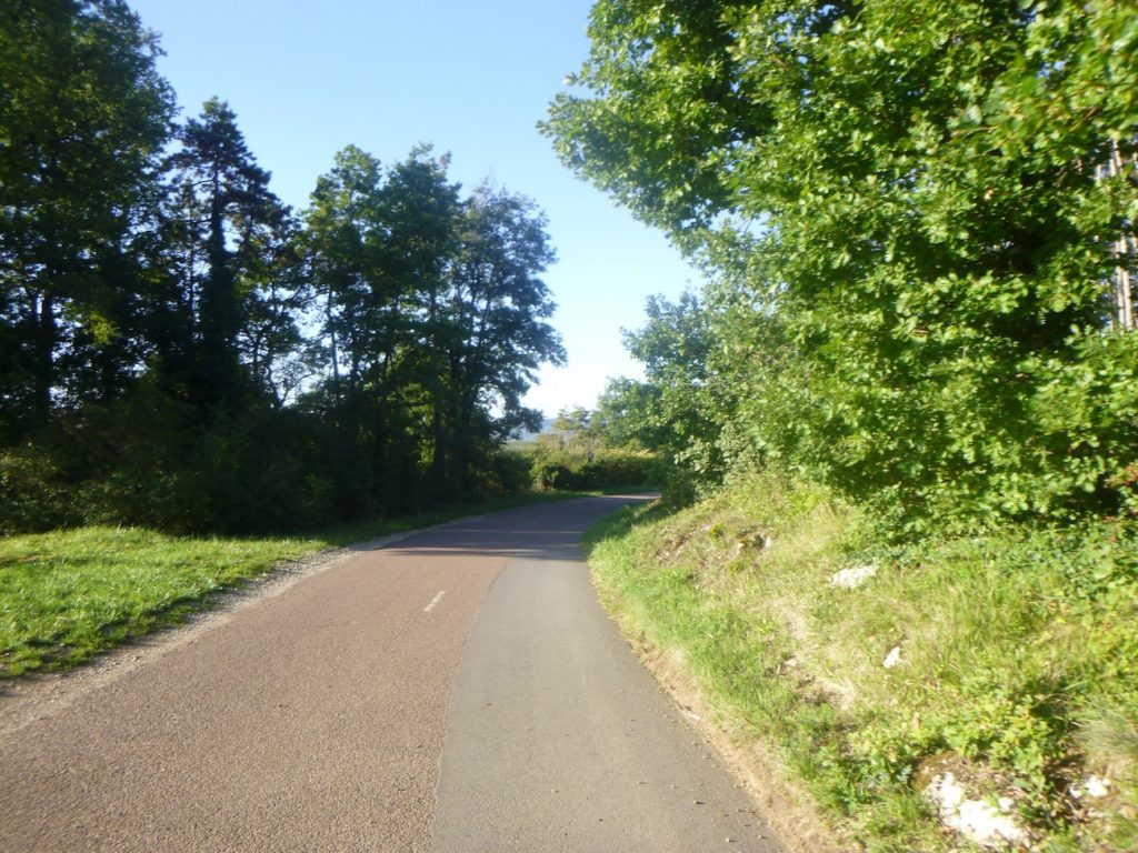 | Puis la route descend doucement dans ce sous-bois, serpentant à l’ombre des troncs, comme si elle voulait prolonger la quiétude de ce refuge avant de retrouver la clarté des coteaux. |