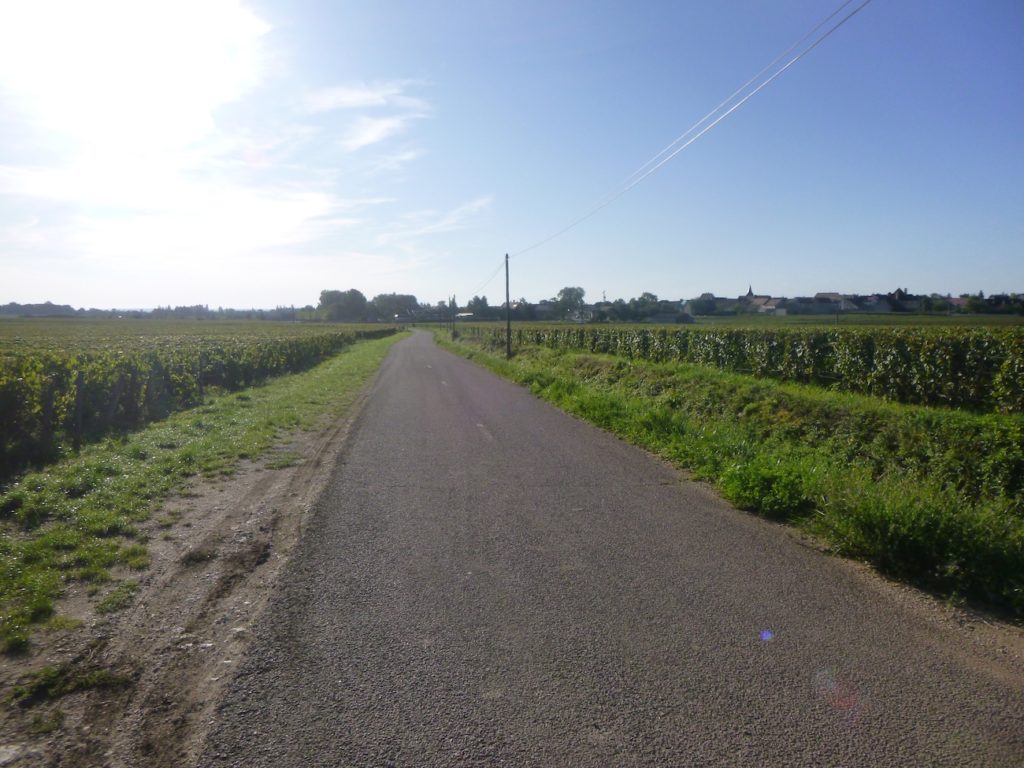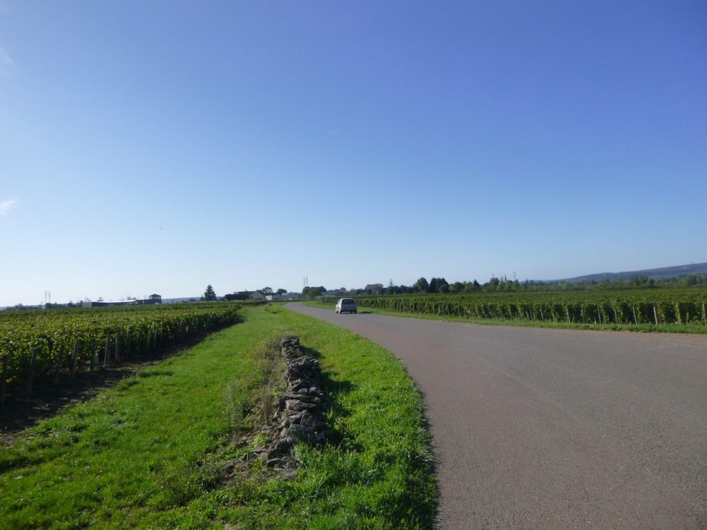 | À la gauche de la route, la départementale file parallèlement, large ruban de bitume longeant les vignes de la plaine. Le contraste est net entre le pas du marcheur, mesuré et lent, et la vitesse des véhicules qui glissent au loin. |