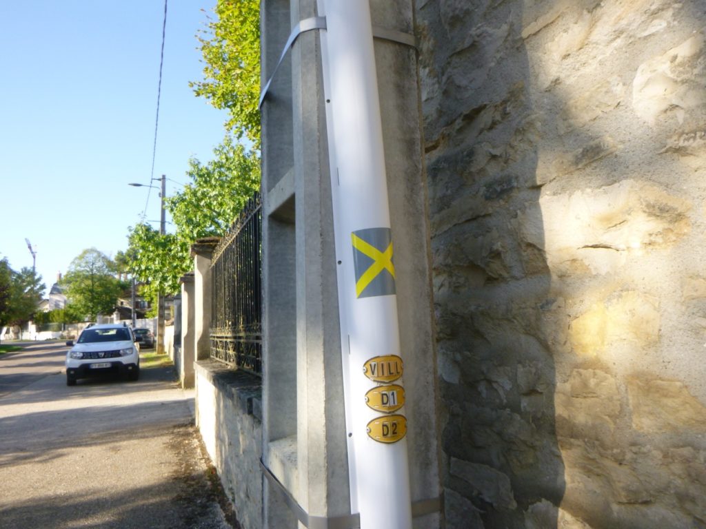| Au bout de la rue, le parcours tourne à droite. Une coquille, soigneusement ordonnée, en indique la direction et marque le départ hors de Meursault, comme un dernier signe de la main avant de s’élancer au cœur des vignes. |