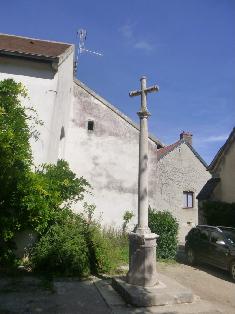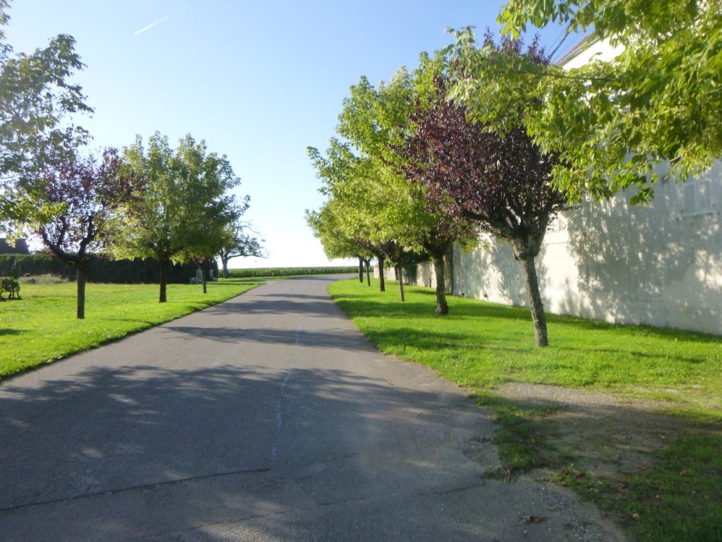 | La rue, bordée d’arbres, s’échappe discrètement du village, comme si elle voulait offrir au marcheur une transition douce vers les vignes. En chemin, vous croiserez une croix barrée, signe étrange et déroutant, semblant indiquer que vous ne seriez pas sur le bon parcours. Quelle absurdité ! Encore une de ces bizarreries dues aux organisateurs des chemins balisés dans la région. Qu’on se rassure : c’est bien par cette rue que passe le tracé, et nul besoin d’hésiter. |