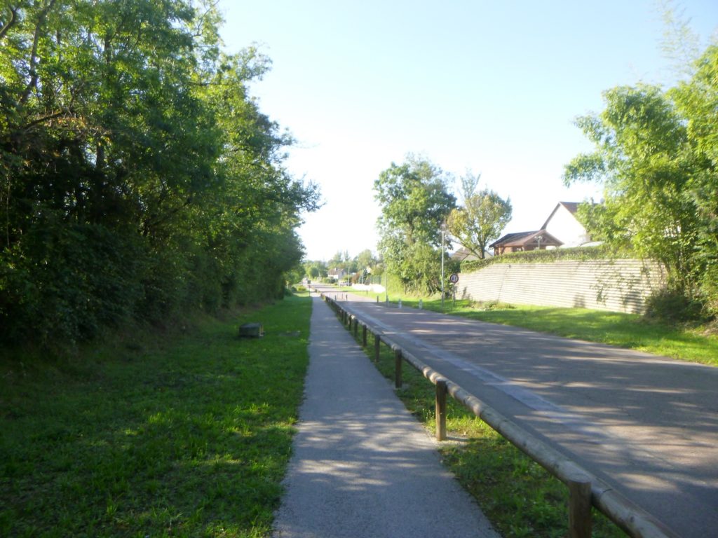 | La piste cyclable effectue alors un petit crochet, mais l’indication est claire et rassurante, renforcée une fois encore par la coquille. Comme un clin d’œil bienveillant, elle assure le marcheur qu’il est sur la bonne voie. |