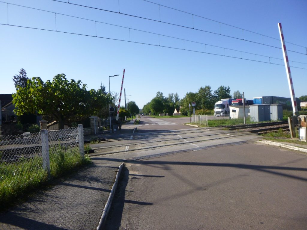 | Un peu plus loin, la route traverse la voie ferrée, ligne métallique qui coupe le paysage d’un trait rectiligne. Ici, vous quittez la Cite d’Or pour entrer en Saône-et-Loire. |