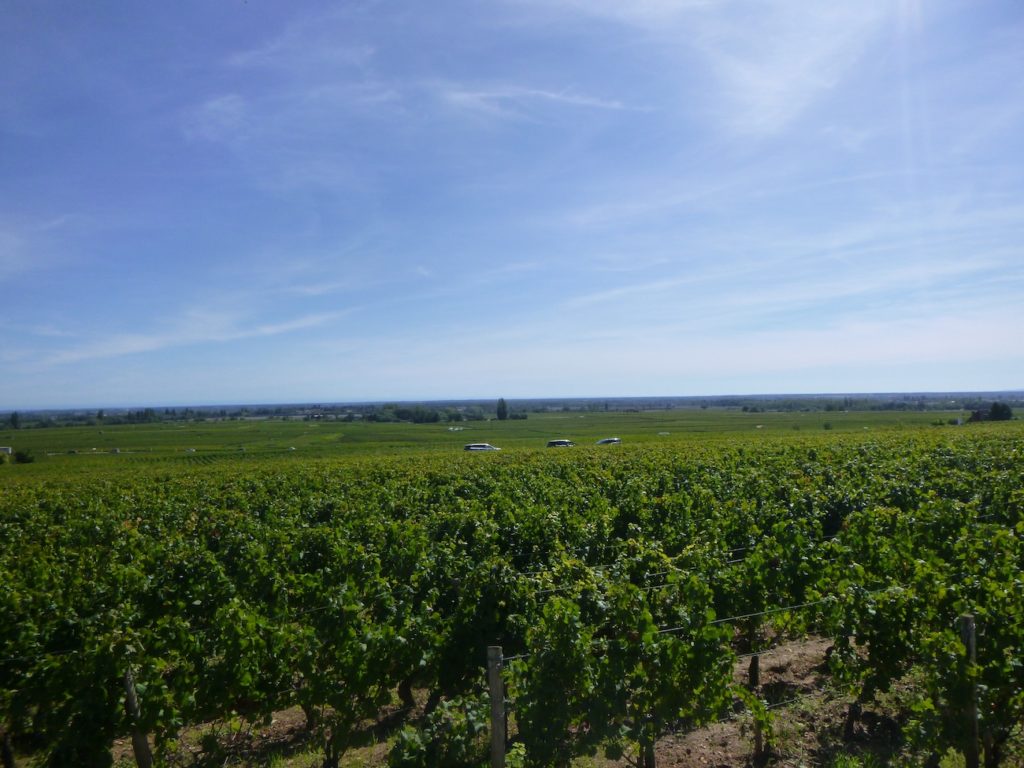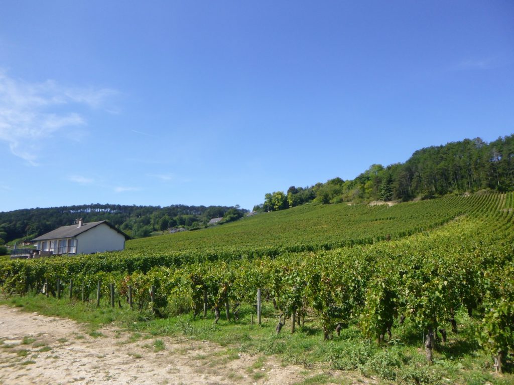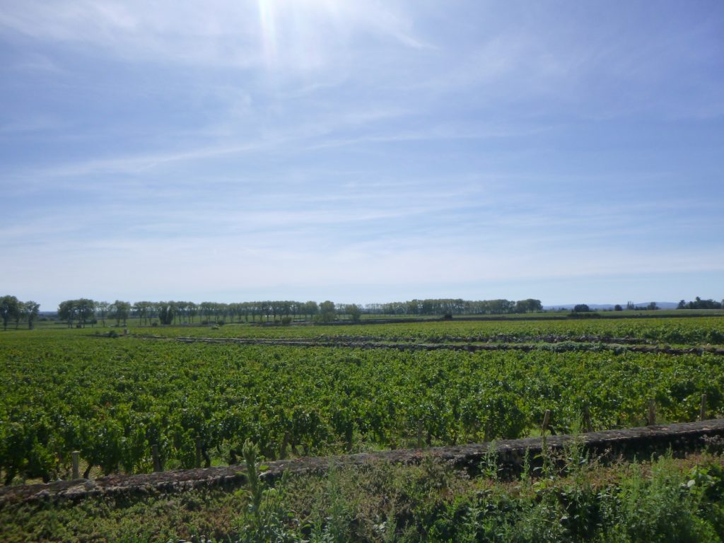 | À l’horizon, un sous-bois se dessine bientôt. Sa masse verte annonce une promesse de fraîcheur, comme une oasis boisée au milieu de l’océan de vignes. |