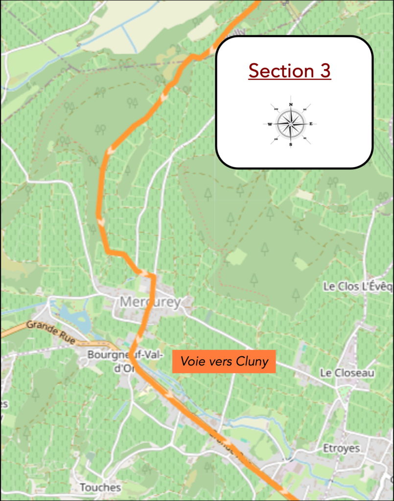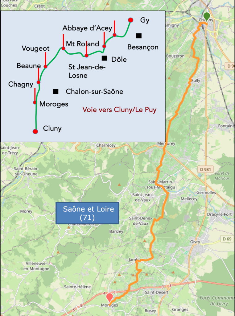 Bien sûr, c’est à droite qu’il faut aller, dans le sillage des marques rouges et blanches du GR. Pourquoi ? Parce que le Chemin de Compostelle épouse ici le même tracé que le GR76, à de rares exceptions près. Le GR76, chemin de grande randonnée, traverse la Bourgogne en révélant ses collines, ses vignes et ses villages, tout en suivant la vallée de la Saône-et-Loire. Il est le compagnon discret et fidèle du pèlerin, un fil rouge qui mène jusqu’à Cluny, capitale spirituelle dont l’écho résonne encore dans les pierres et les mémoires.