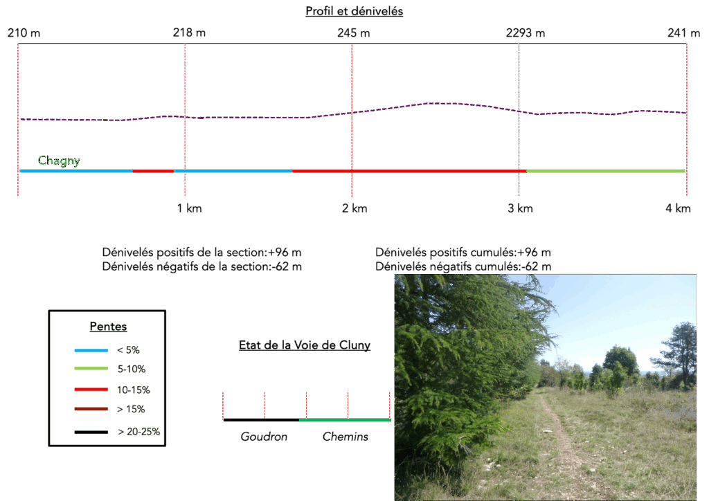 Difficulté du parcours : Le trajet présente des dénivelés raisonnables (+ 250 mètres/-239 mètres), si vous suivez l’itinéraire proposé. Il y a toutefois, deux collines à gravir, celle qui conduit au Domaine de la Folie, puis celle, longue, du Plateau de Tartignats. Si vous suivez le Chemin de Compostelle jusqu’à Moroges, ce sera plus pénible avec des dénivelés plus imposants (+655 mètres/-/534 mètres).