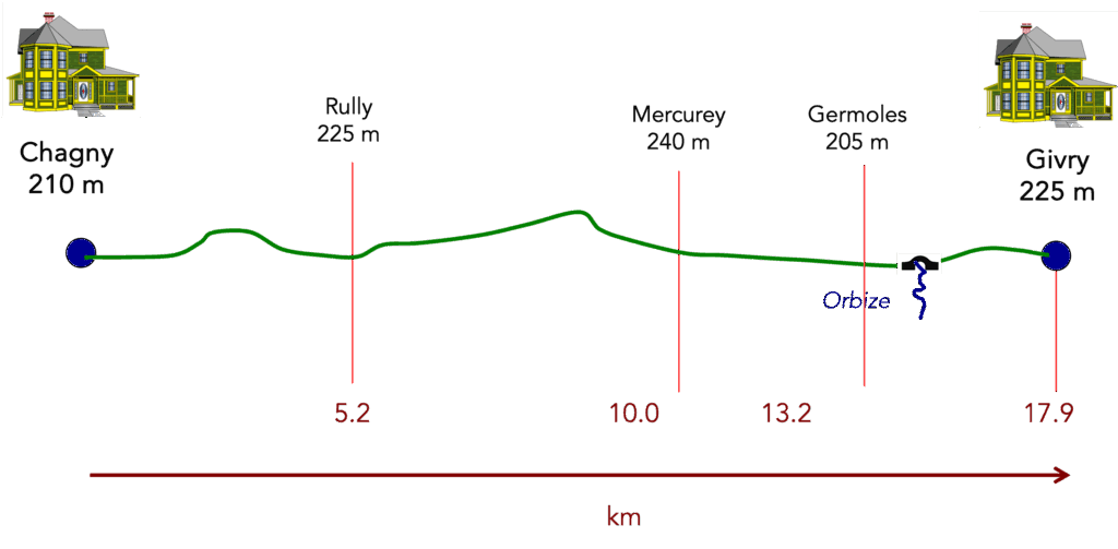 Aperçu général des difficultés du parcours : parcours avec parfois des pentes marquées en descente vers Mercurey, puis à plat sur la route.