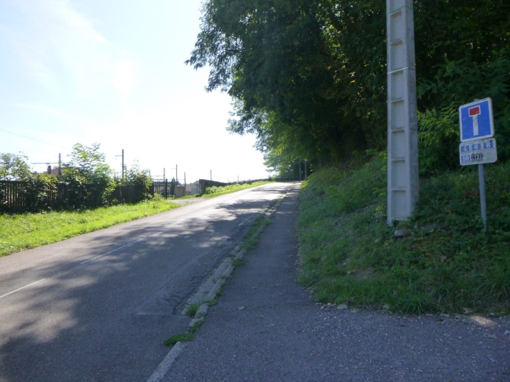 | La route, droite et résolue, traverse de nouveau la voie ferrée, puis s’élève au-dessus de la gare. D’en haut, le regard embrasse à la fois les rails qui s’allongent vers le lointain et la silhouette paisible de la petite cité. C’est un passage suspendu, comme une respiration entre deux mondes : celui de l’agitation urbaine et celui de la marche méditative. |