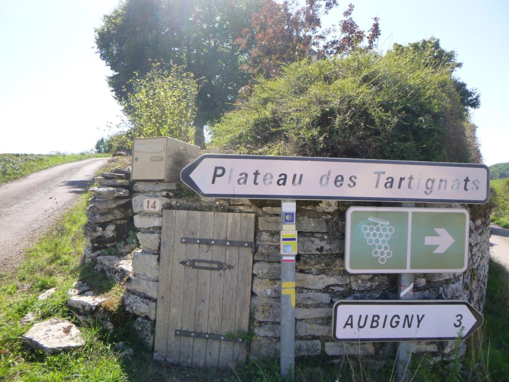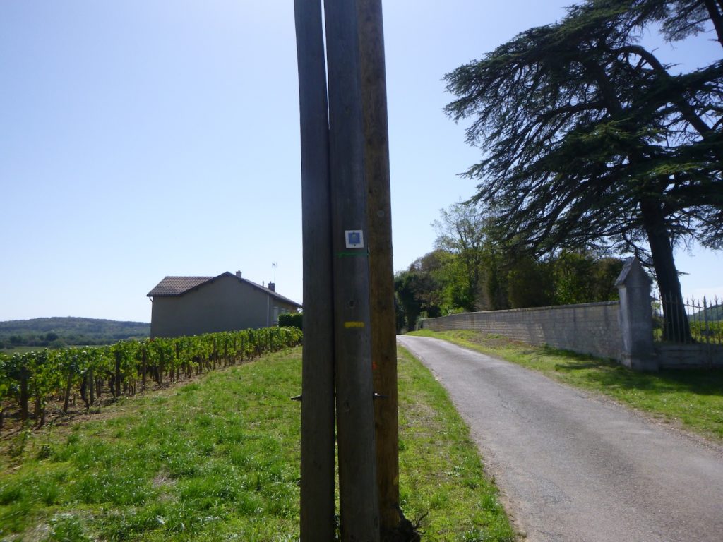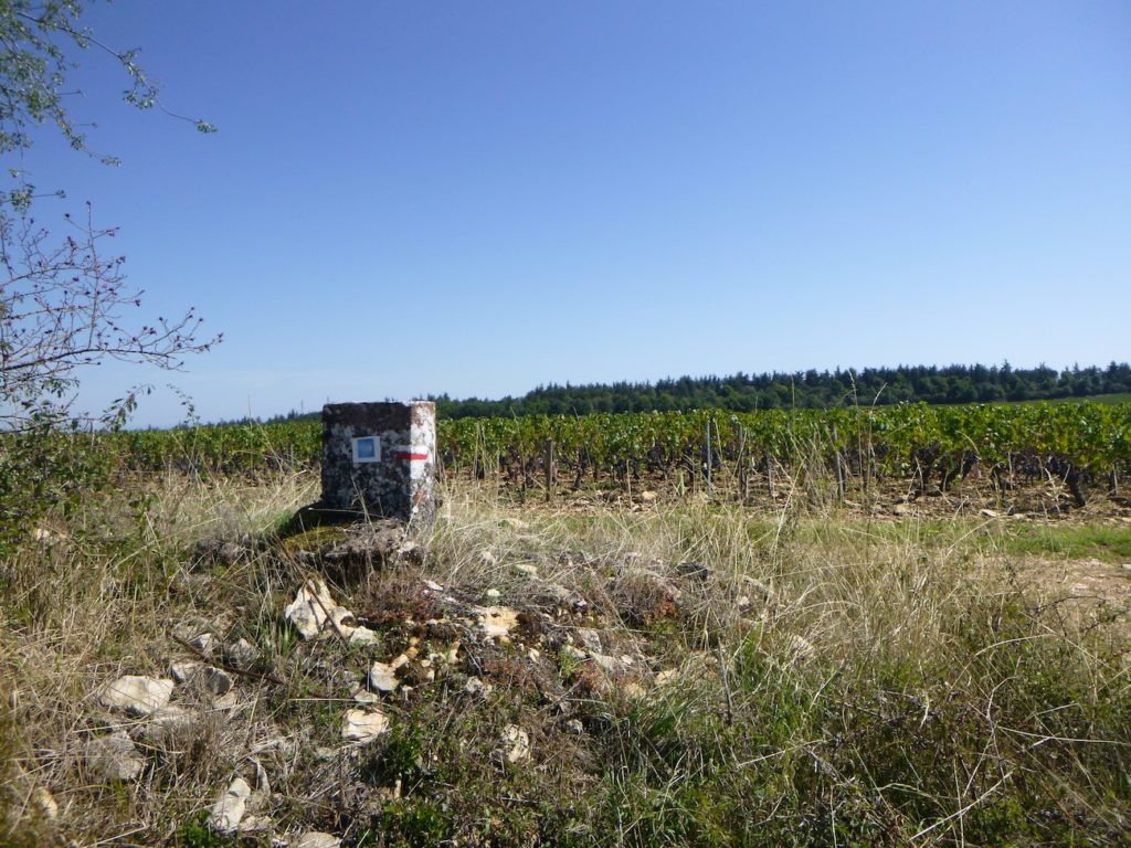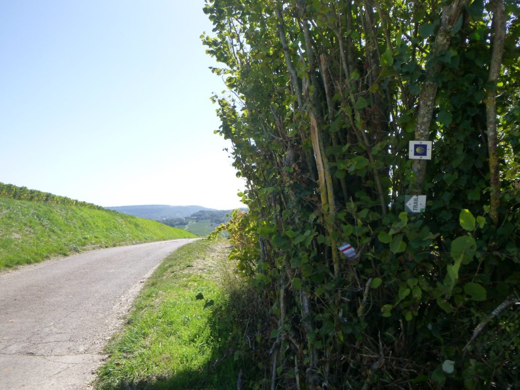 Et pourtant, devant vous se dresse une énigme. C’est plat et vous croyez un instant que le chemin a atteint le plateau des Tartignats. Mais où poursuivre ? À droite ? Tout droit ? Même le petit guide des Amis de Compostelle, parfois précieux, demeure muet face à ce carrefour trompeur. Ici, seuls l’intuition ou la chance guident vos pas. Nous-mêmes avons dû l’aide d’un vigneron bienveillant, qui nous a sorti de l’impasse en nous assurant qu’il fallait continuer tout droit. Vous, désormais, n’aurez plus à hésiter : le chemin du plateau grimpe encore, plus haut, vers la colline.