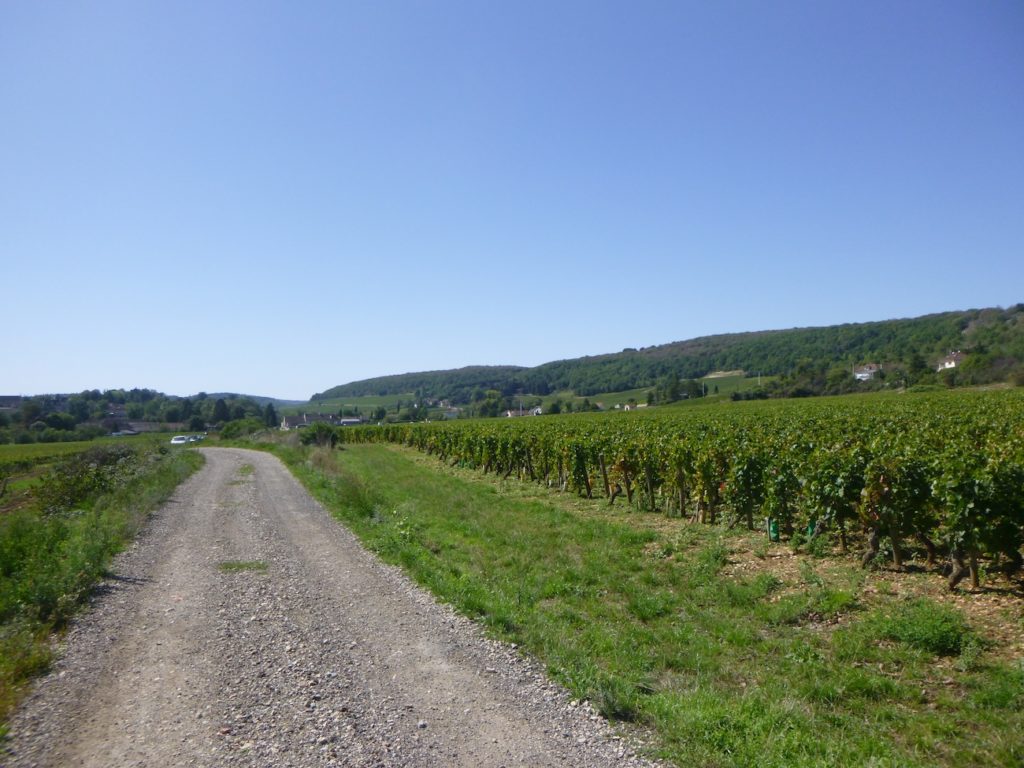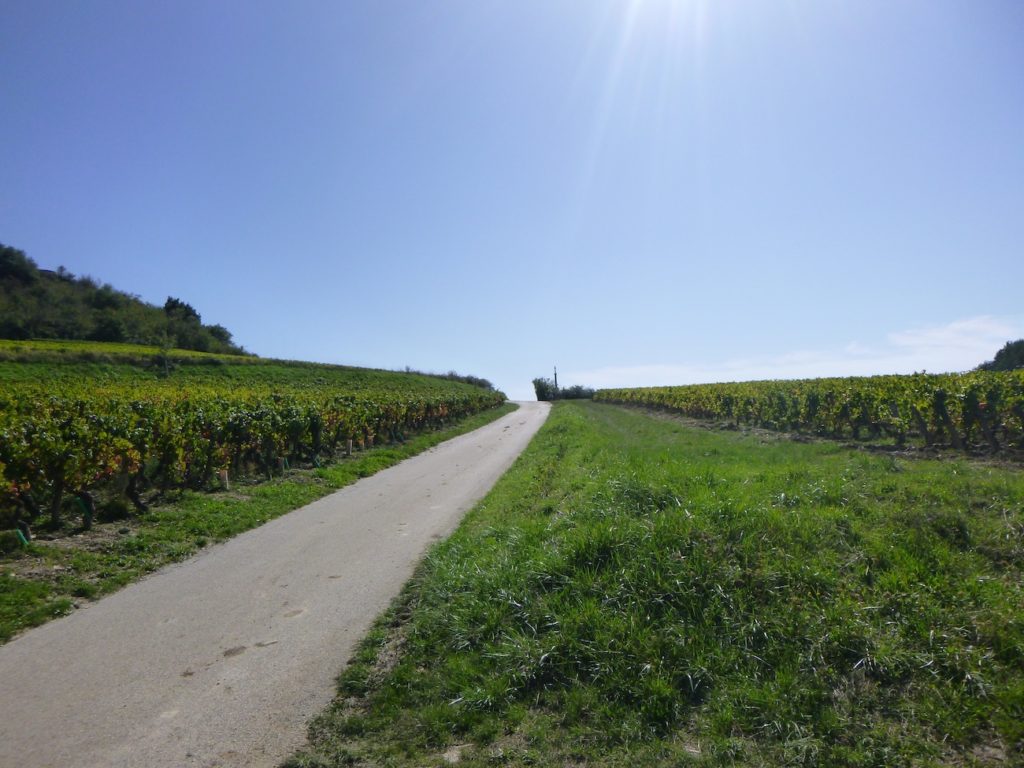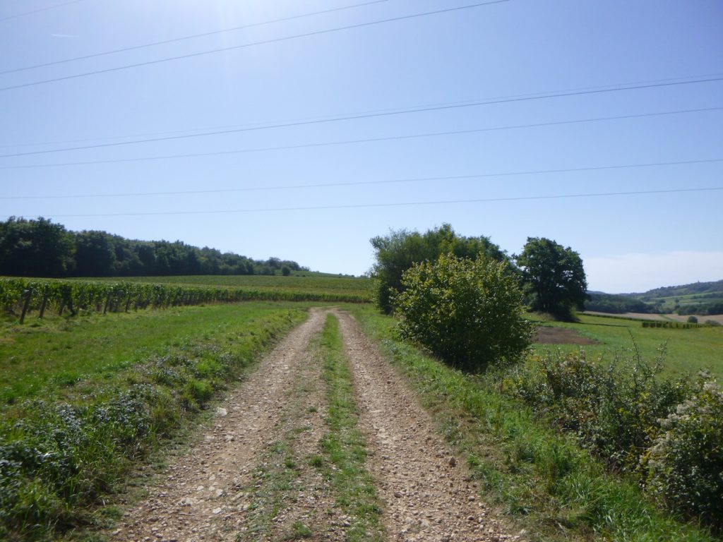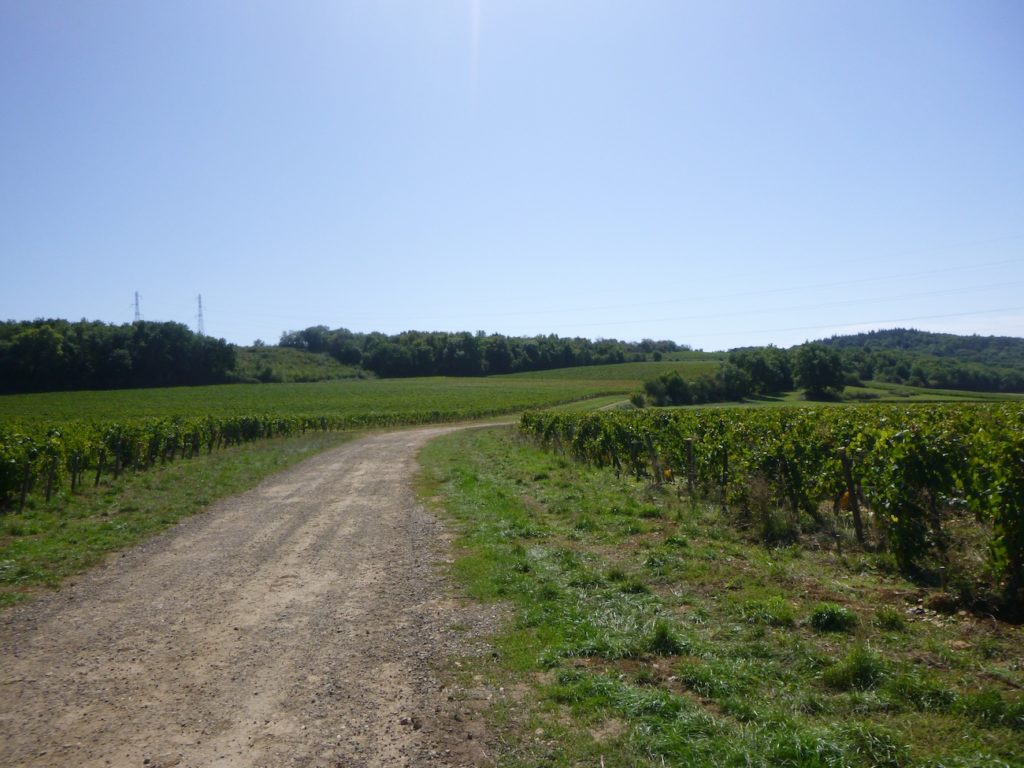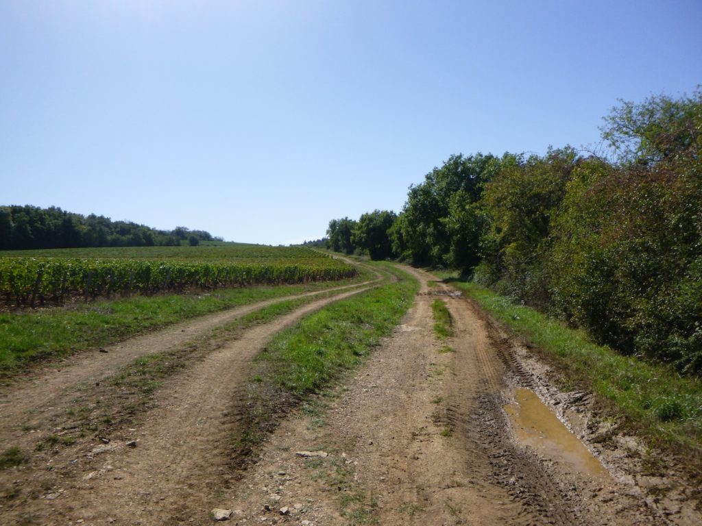 | Le chemin se métamorphose alors en une piste de terre battue, caillouteuse et ferme sous les pas. C’est le Chemin de Branges, qui file droit vers Rully. |