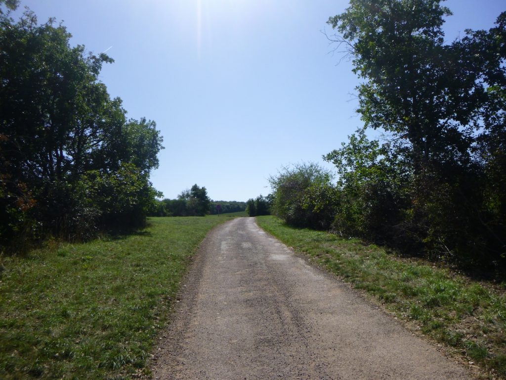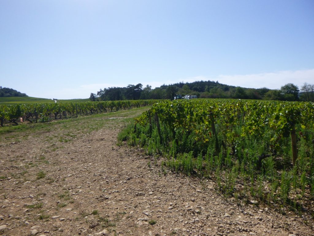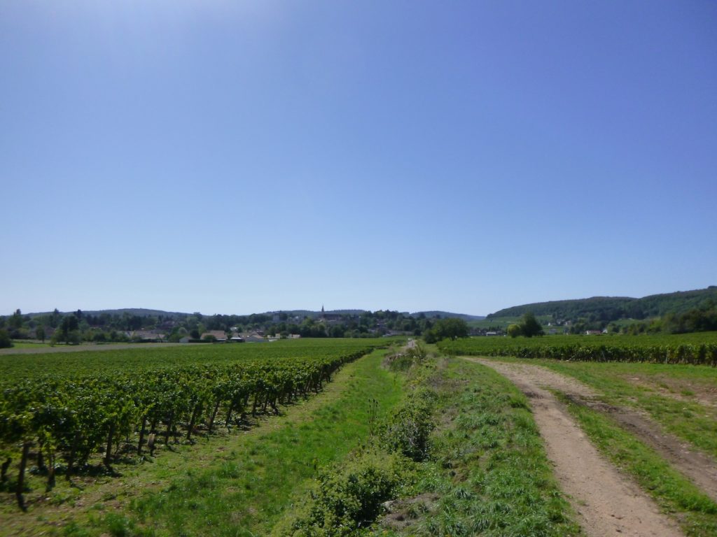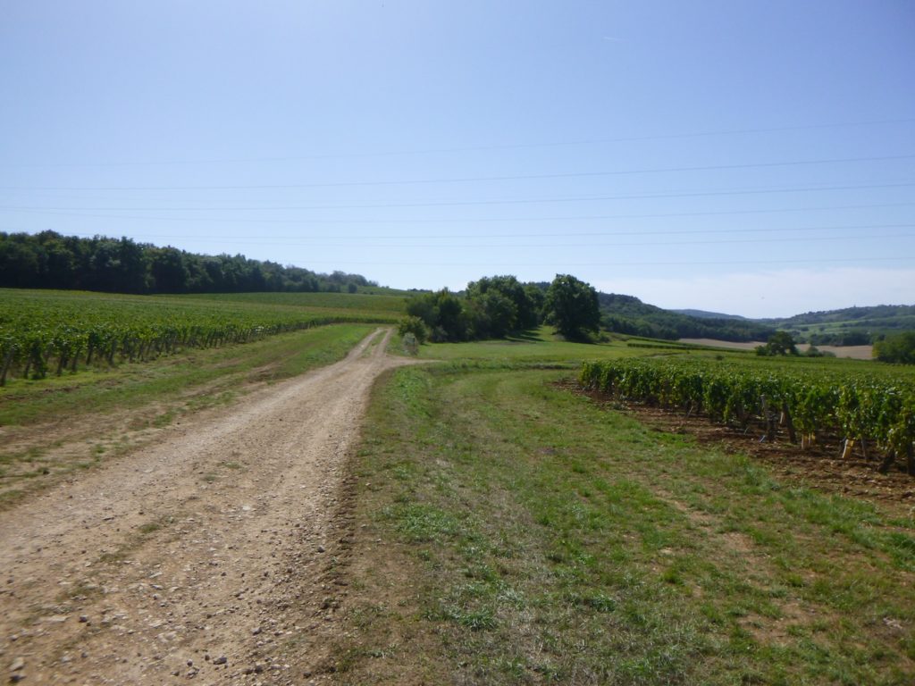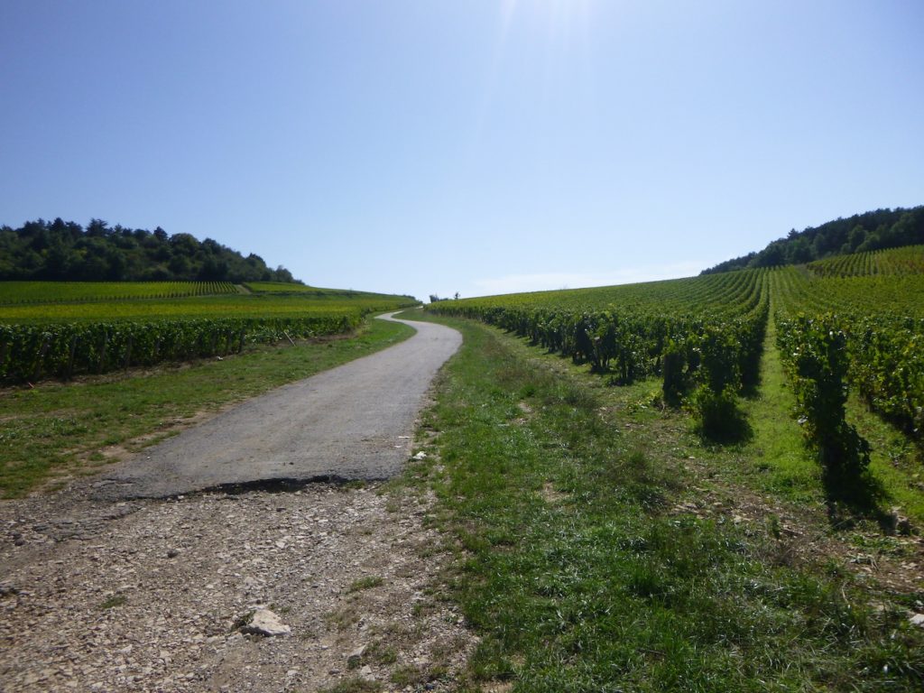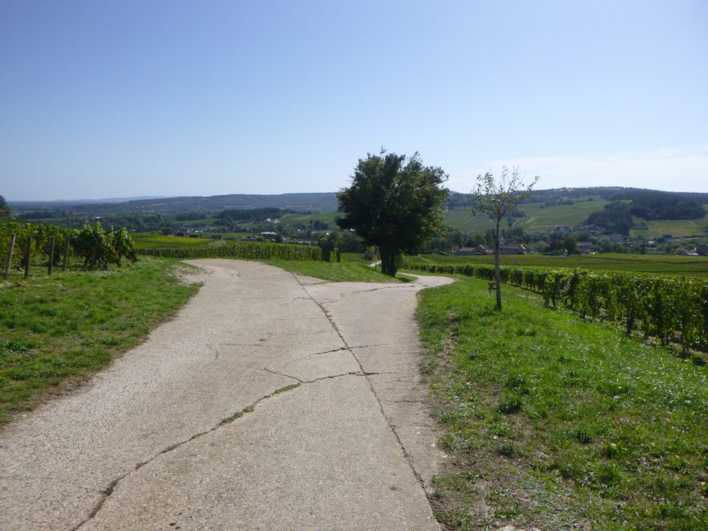 | Le chemin se métamorphose alors en une piste de terre battue, caillouteuse et ferme sous les pas. C’est le Chemin de Branges, qui file droit vers Rully. |