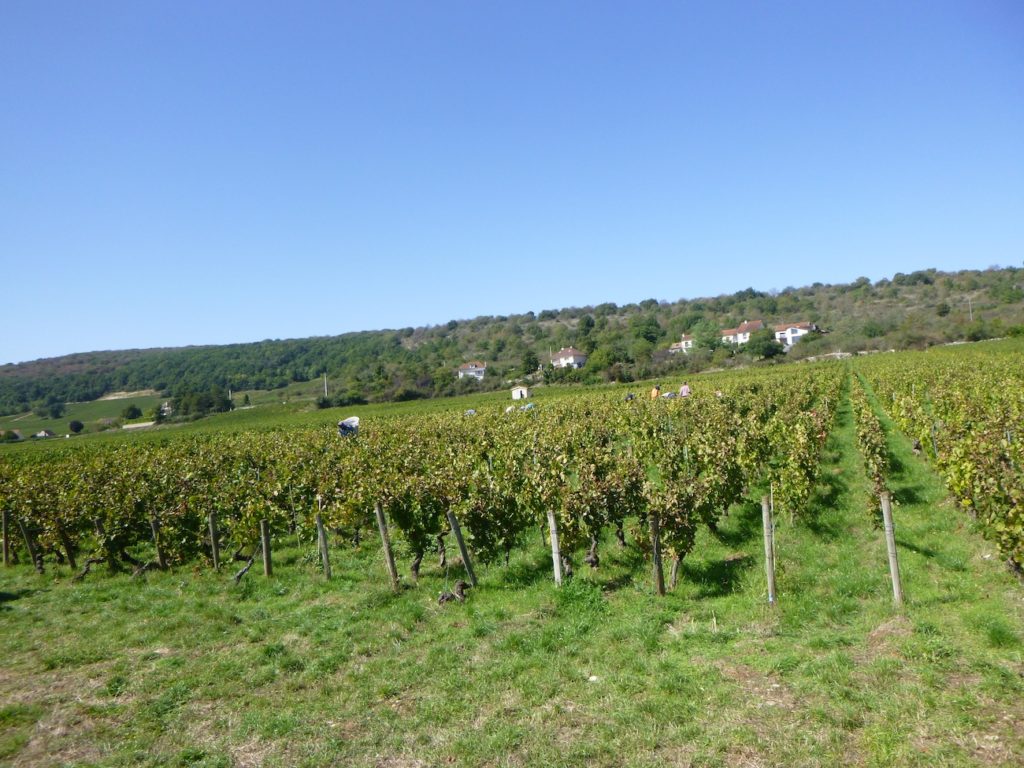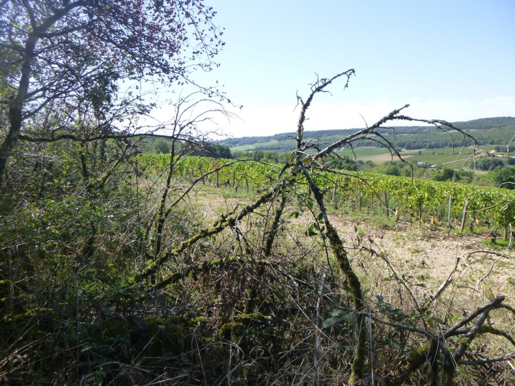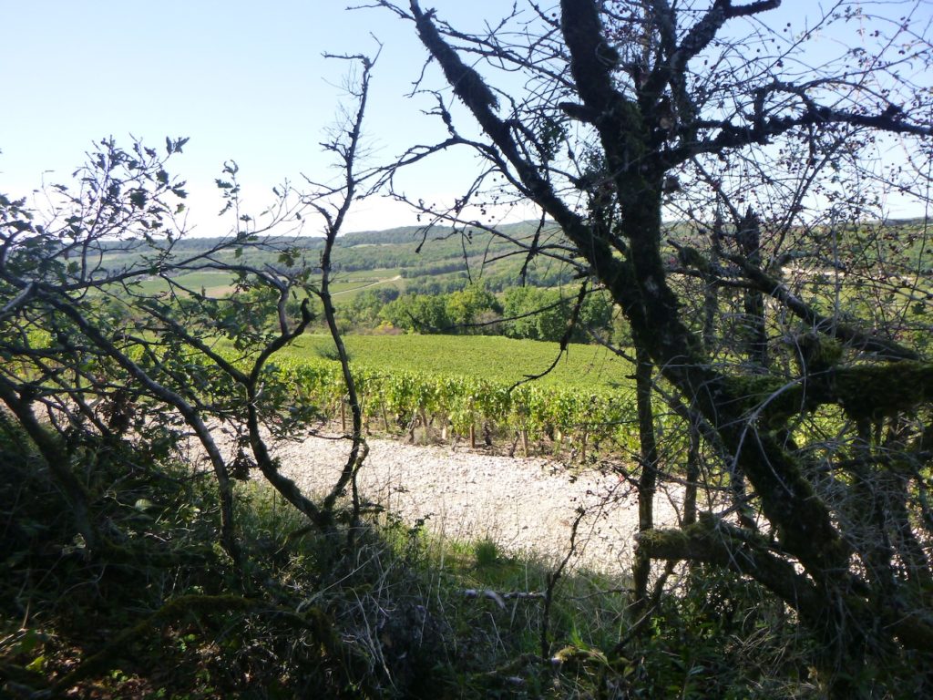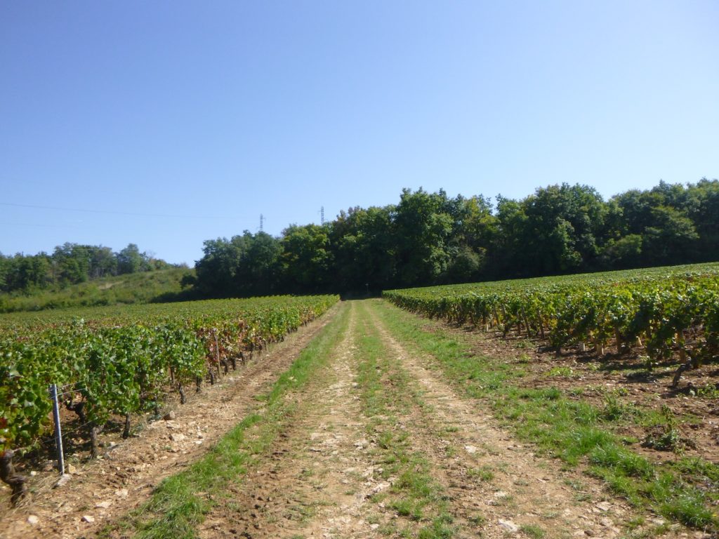 Plus bas, une trouée dans les sous-bois dévoile une vision lumineuse : les vignobles s’étendent sur le coteau, juste au-dessus de la plaine. Les rangs de ceps, ordonnés comme des lignes d’écriture, dessinent une promesse d’abondance.