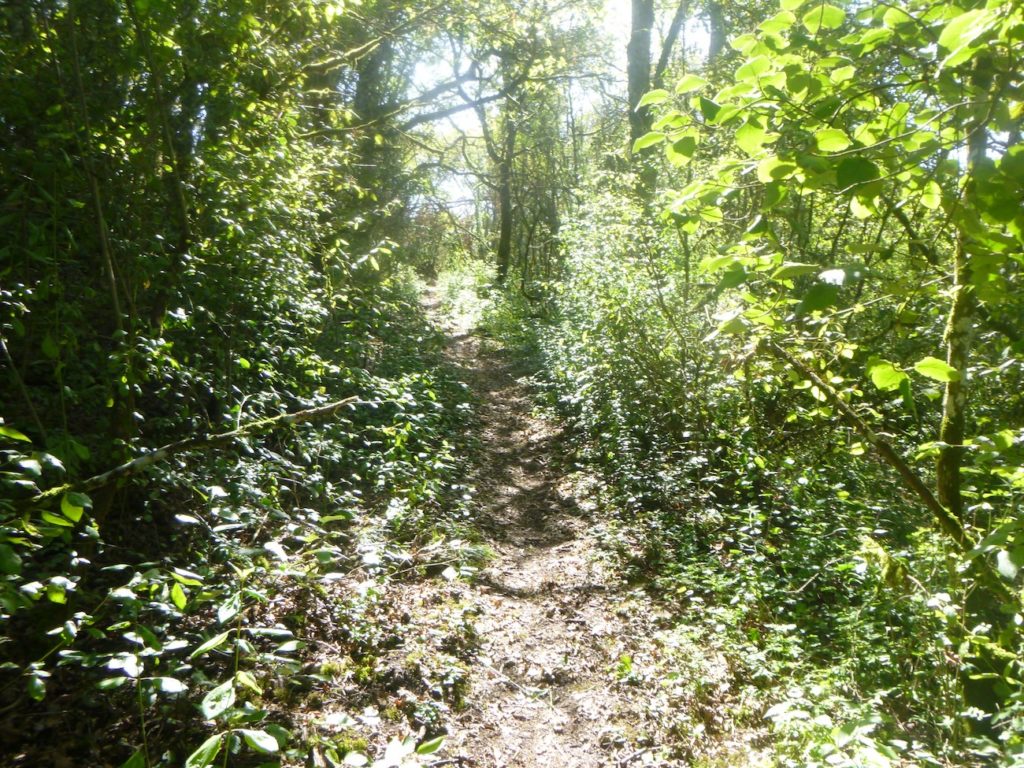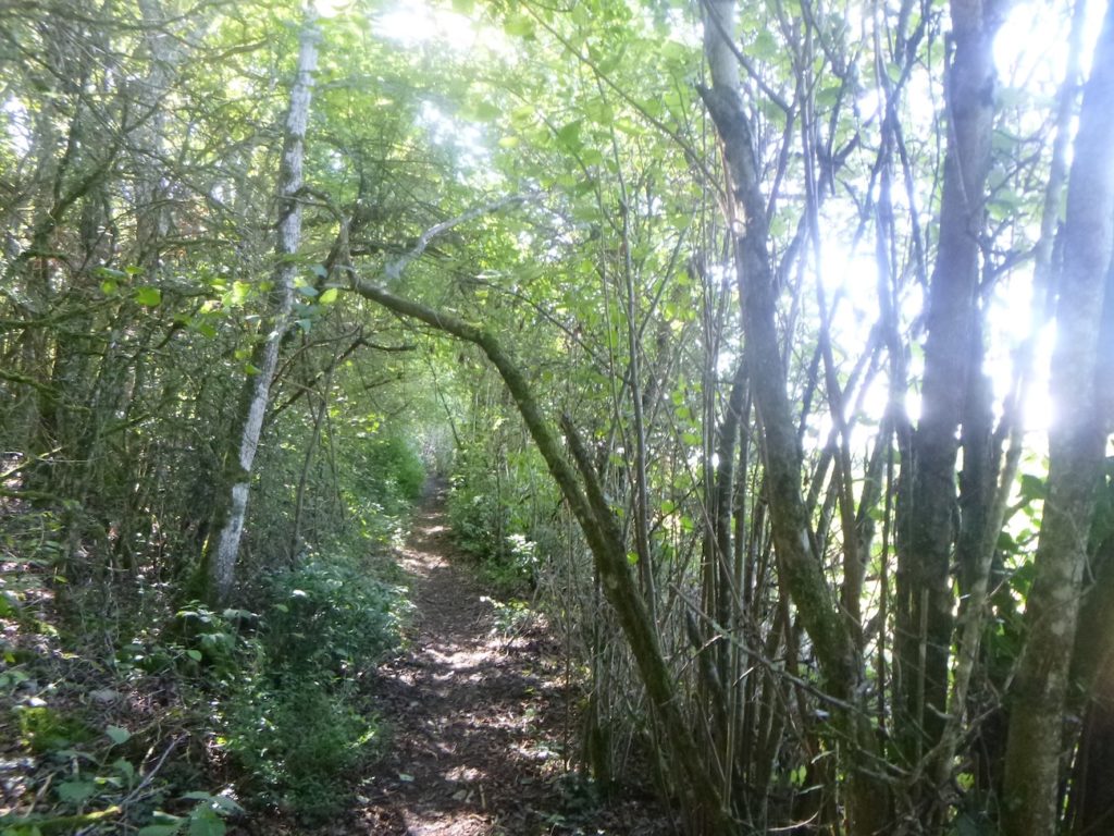 | Le chemin de Montmorin se révèle alors comme un adorable petit sentier. Il serpente avec grâce, grimpant en pente douce dans le sous-bois sauvage. On croirait qu’il danse, léger, entre les arbres, se jouant de leurs racines et de leurs ombres. |