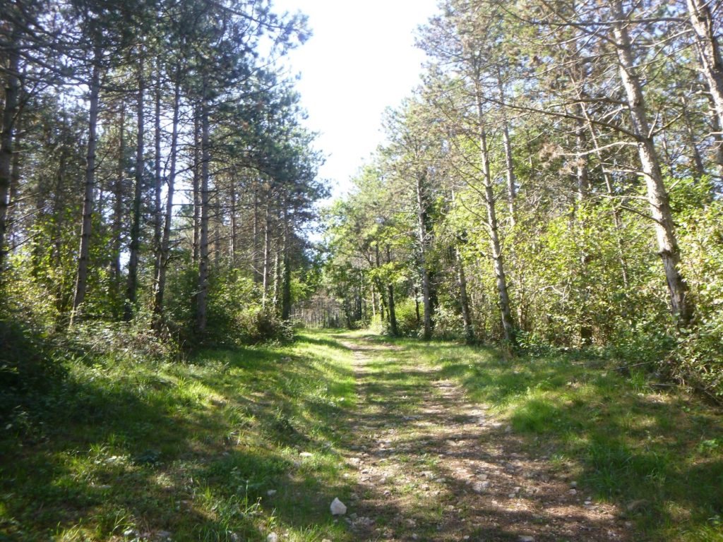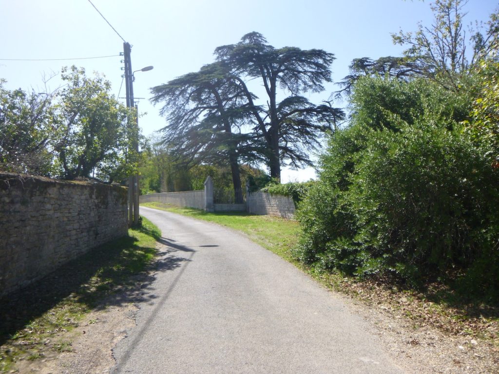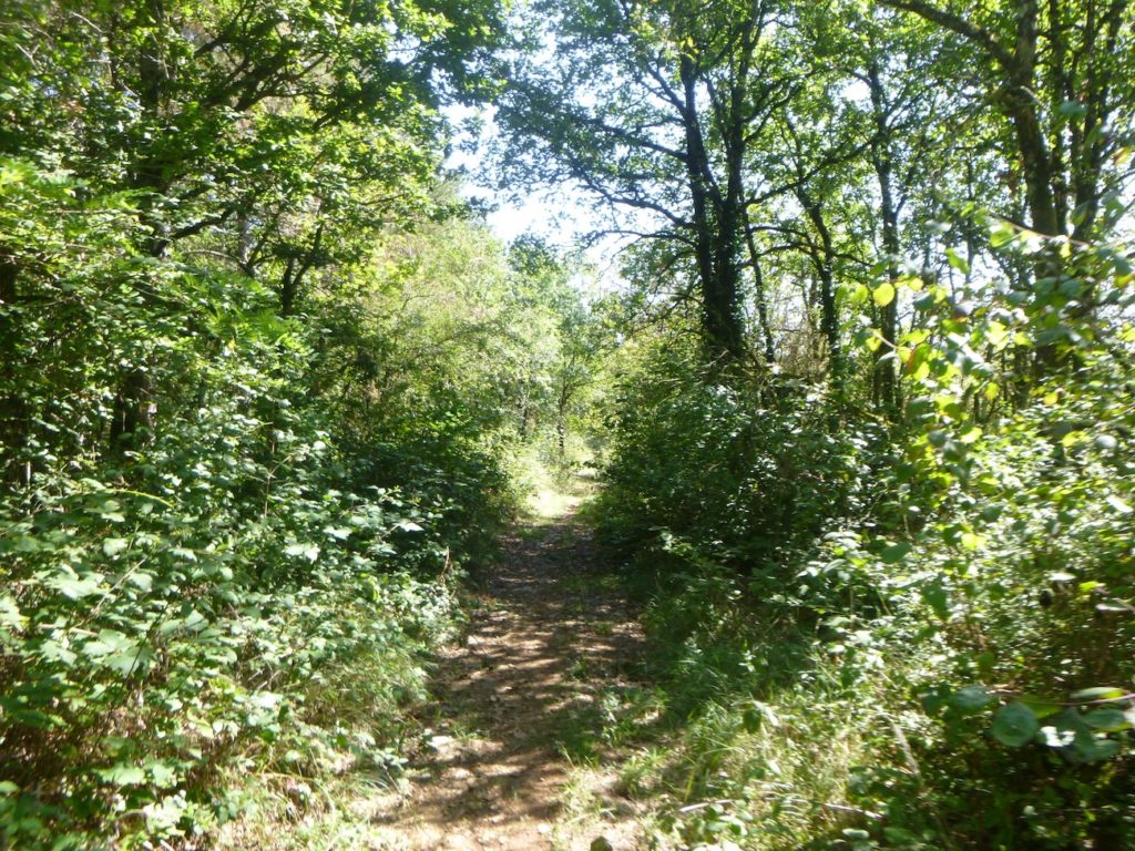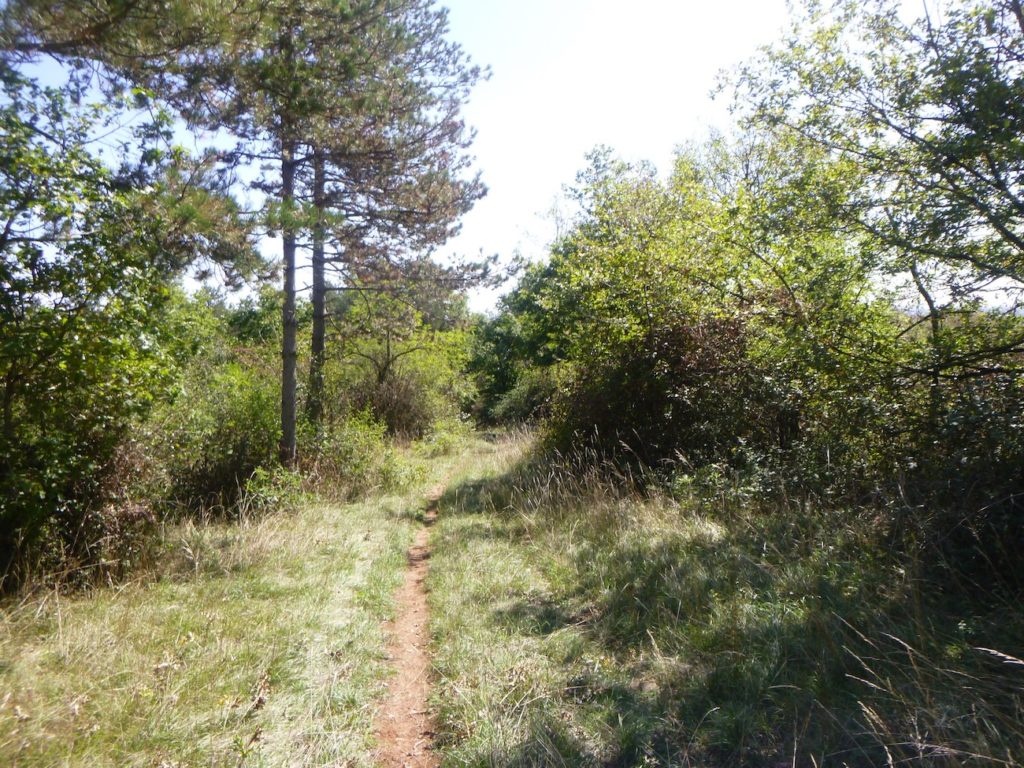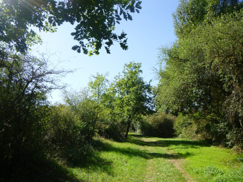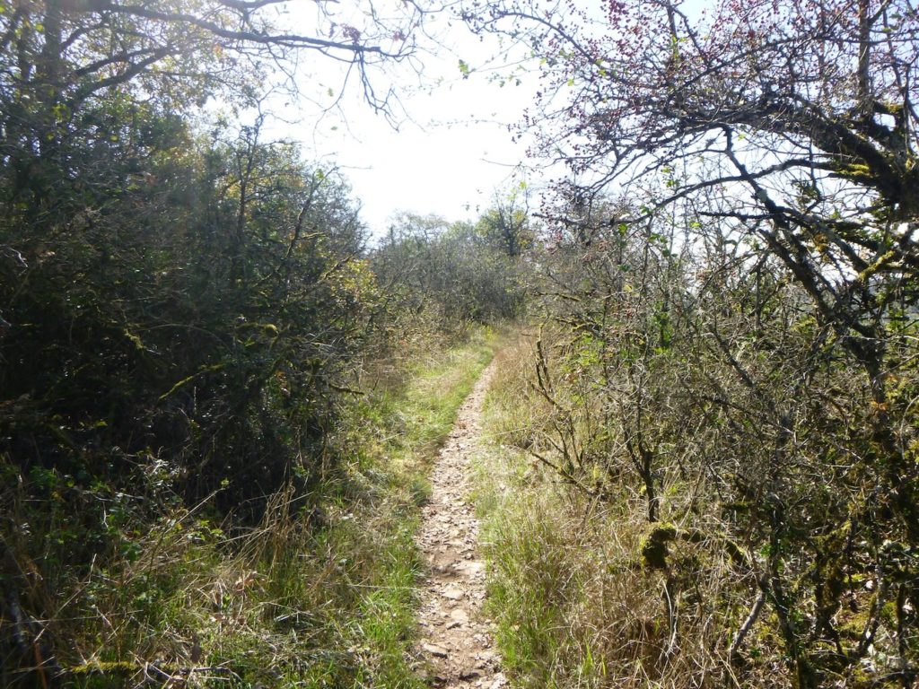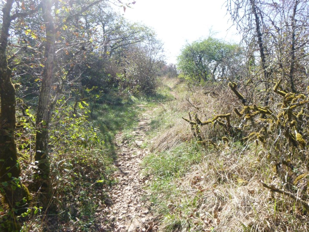 | Le chemin caillouteux s’élève avec une pente soutenue, gravissant les coteaux tapissés de vignes. Plus haut, il se fait plus intime, frôlant un sous-bois de buissons épais et de grands chênes qui dressent leurs troncs massifs à votre droite, comme des gardiens de pierre et d’ombre. |