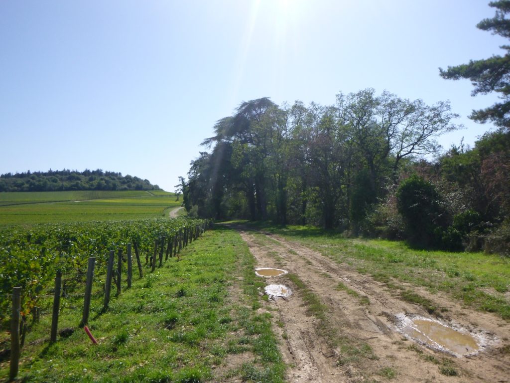 | Plus haut, les vignes font leur retour, s’imposant au-dessus du chemin, ordonnées et lumineuses. Après l’ombre, la clarté : le vignoble reprend ses droits. |
