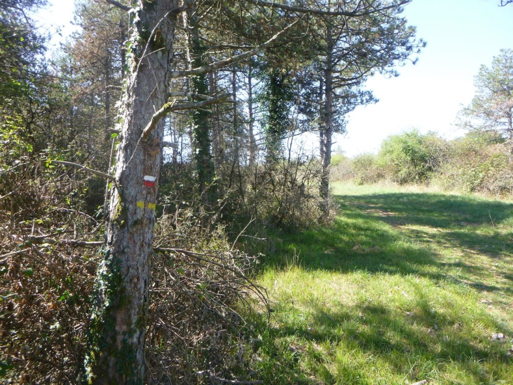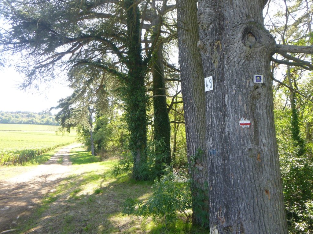 | Le large chemin se déploie entre vignes et sous-bois. Les marques du parcours, coquilles bleues et bandes rouges et blanches du GR, apparaissent, plaquées sur les troncs de chênes. Ironie du sort : c’est justement ici, où nul ne risquerait de s’égarer, que l’on trouve le balisage le plus généreux, presque envahissant. Comme si la forêt elle-même voulait vous retenir, insistant sur une direction qu’elle n’a pas besoin de donner. |