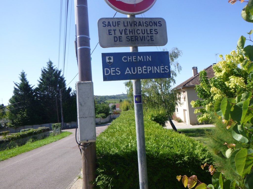 | Après le pont, l’itinéraire prend le nom champêtre du Chemin des Aubépines. Là, enfin, les flèches du Chemin de Compostelle reprennent leur rôle, rassurantes et justes. Sous leur signe, le pèlerin retrouve la certitude de marcher dans la bonne direction. |