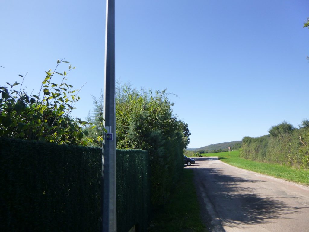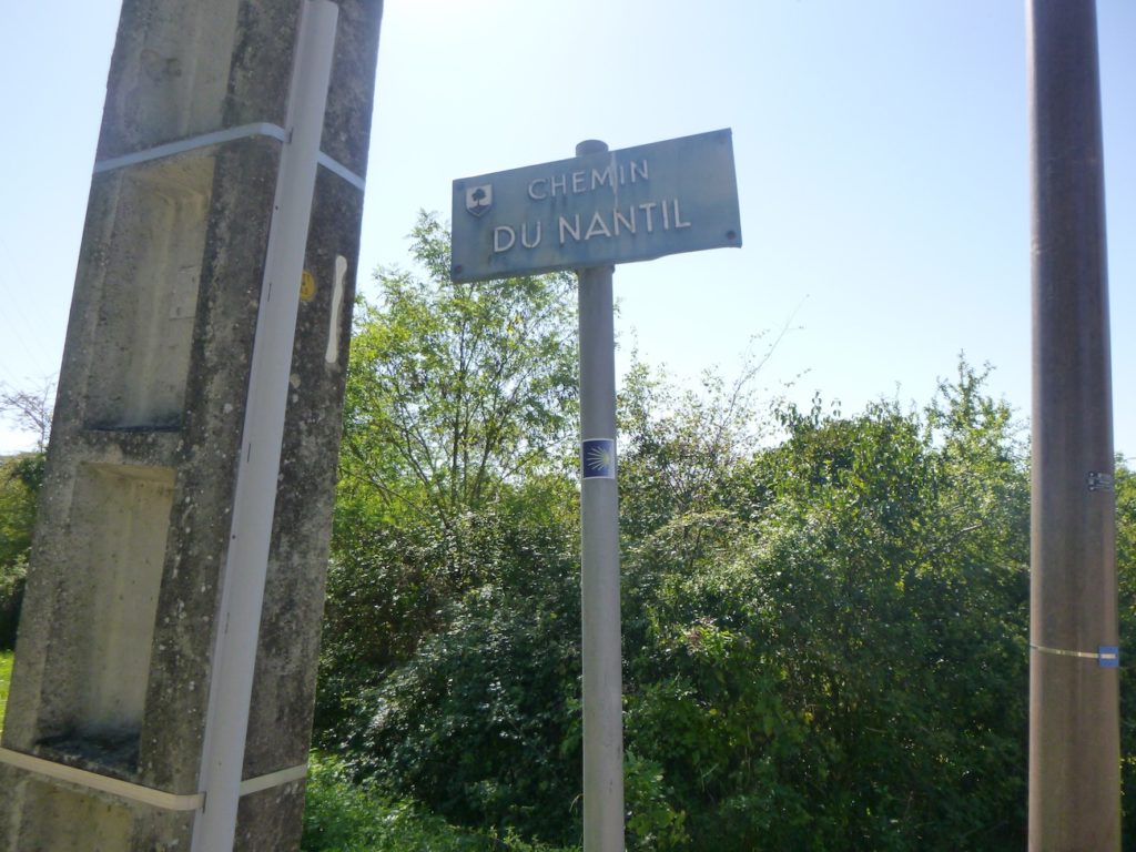 | Peu après, le parcours bifurque sur le Chemin de Nantil, où une coquille mal orientée semble vouloir égarer le marcheur distrait. Pourtant, la voie s’élève doucement, bordée de lotissements impeccablement alignés, avec leurs haies de thuyas taillées comme des murailles vertes. |