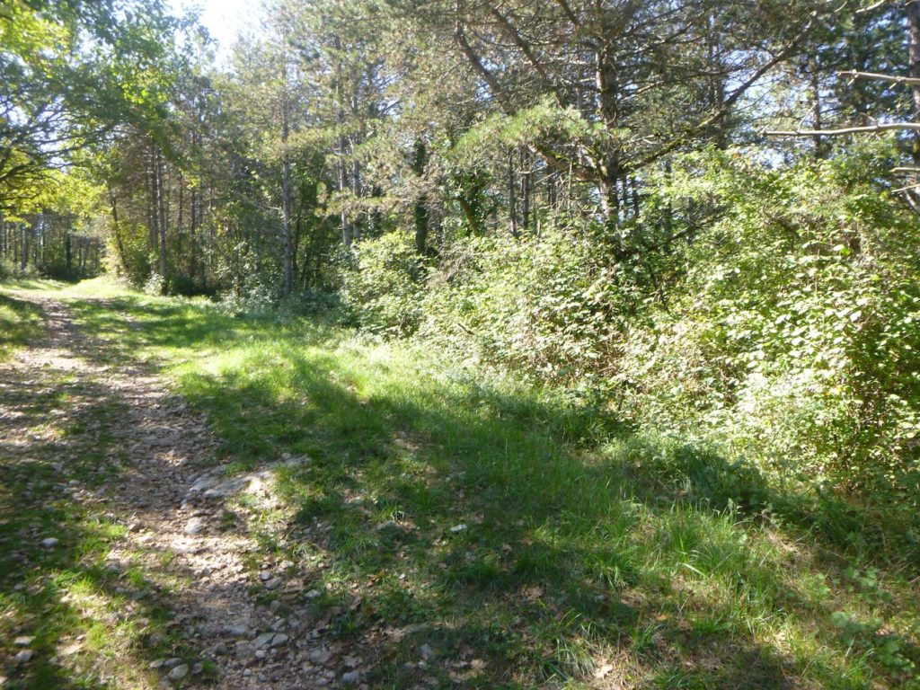| C’est un joli et large chemin d’herbe qui grimpe avec vigueur dans le sous-bois. Chaque pas s’enfonce dans la verdure, et la pente oblige à lever le souffle comme pour mieux sentir le rythme de la nature environnante. |
