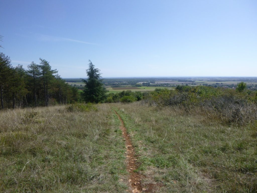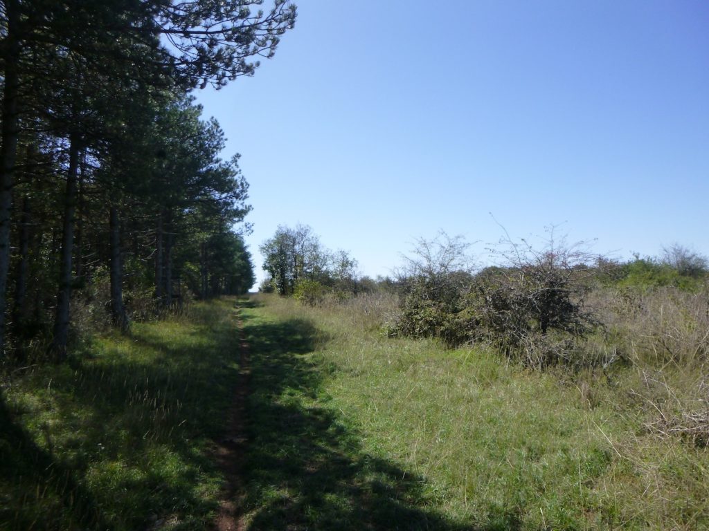 | Au bout de la crête, le chemin se rétrécit et amorce une descente régulière. Le paysage change soudain, prenant des allures de steppe, avec ses pelouses sèches où alternent les chênes clairsemés et les conifères. La marche devient plus méditative, comme si la terre elle-même invitait à ralentir pour mieux en goûter l’austère beauté. |