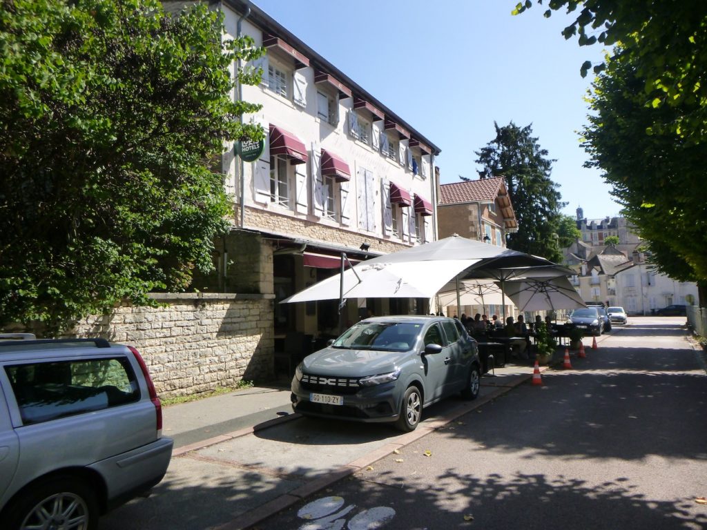 | Au centre du bourg, s’élève un hôtel-restaurant accueillant, lové à l’ombre d’un petit parc verdoyant. Les arbres, larges et généreux, y déploient leurs ramures comme un dais protecteur, offrant un havre de fraîcheur aux voyageurs et aux habitants. |