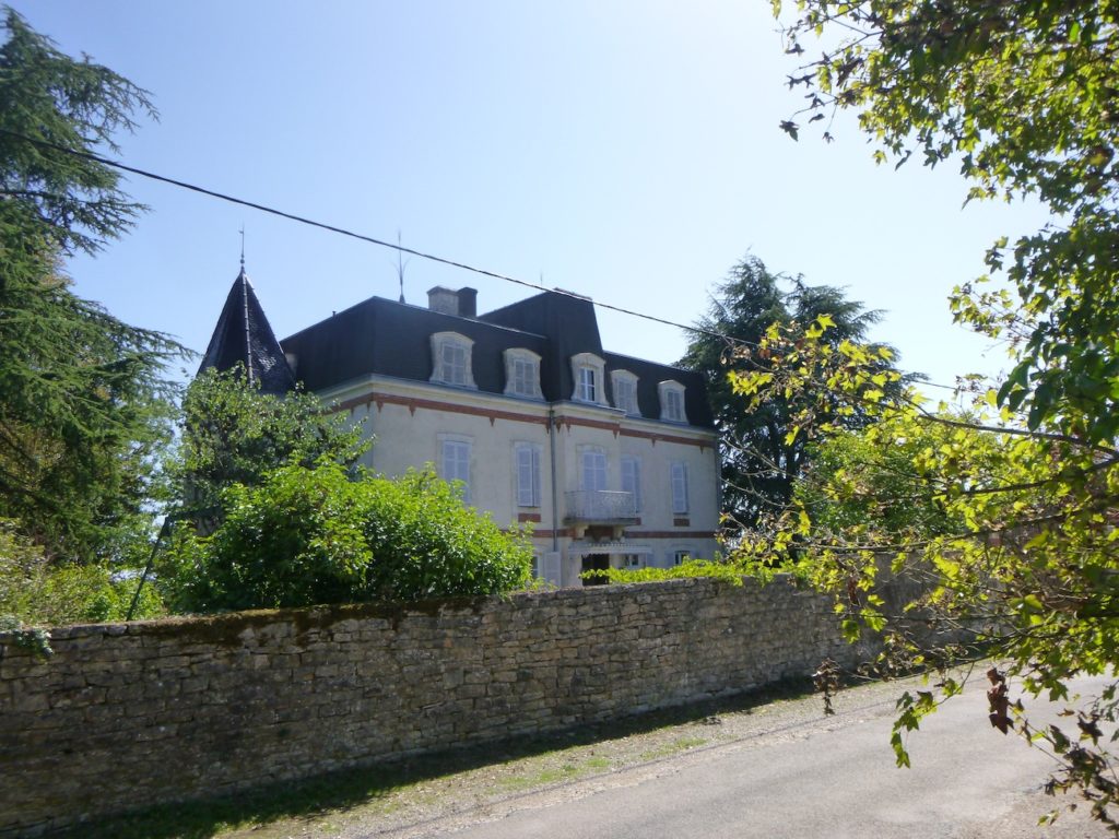 | La route passe devant une demeure élégante, blottie au cœur d’un rideau d’arbres. Les volets sont clos, l’air de sommeil enveloppe la maison, mais ce n’est pas encore le château de Rully. |