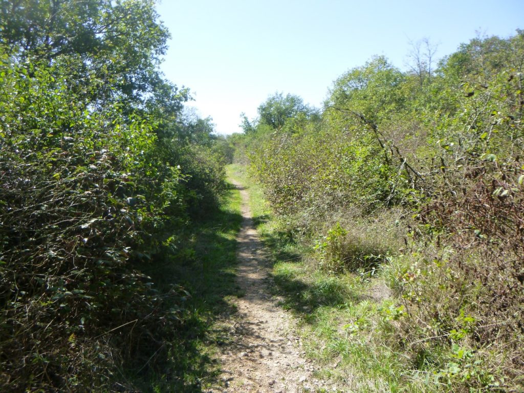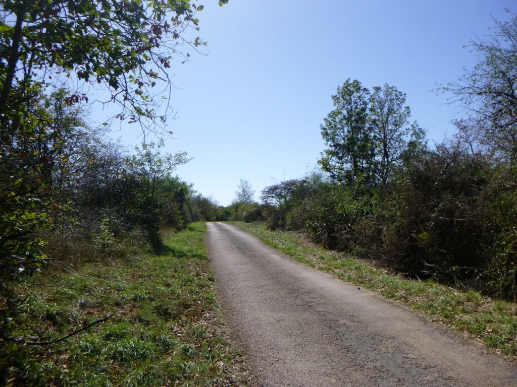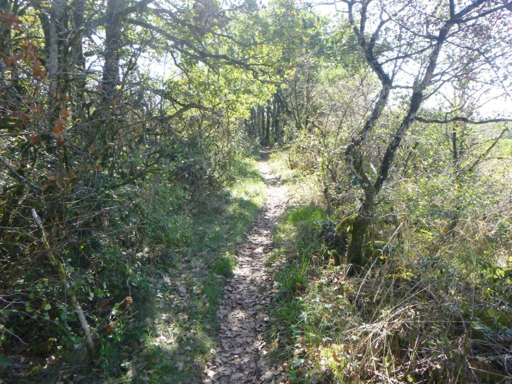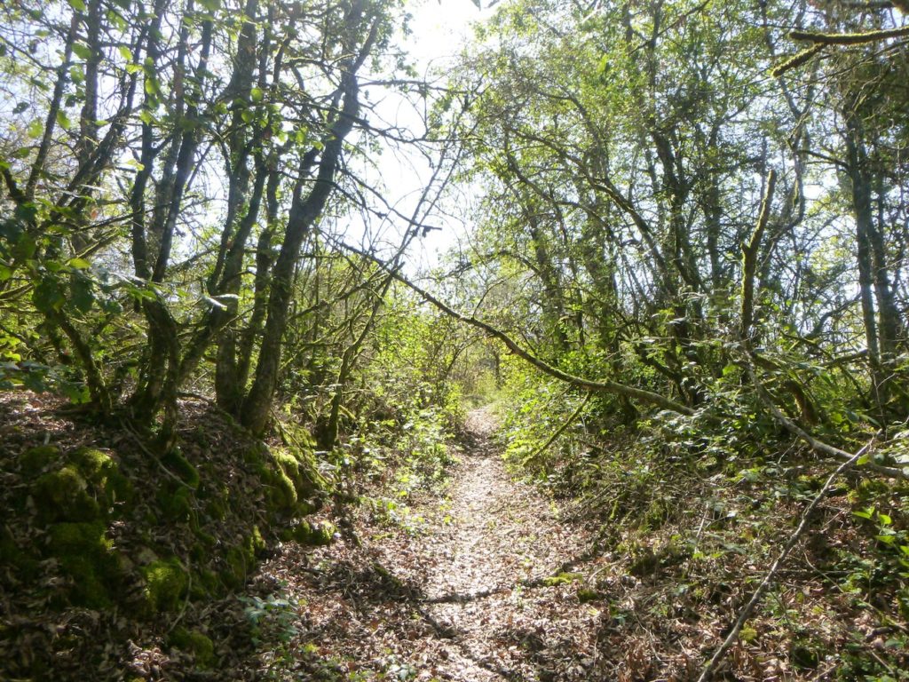 | Le chemin caillouteux s’élève avec une pente soutenue, gravissant les coteaux tapissés de vignes. Plus haut, il se fait plus intime, frôlant un sous-bois de buissons épais et de grands chênes qui dressent leurs troncs massifs à votre droite, comme des gardiens de pierre et d’ombre. |