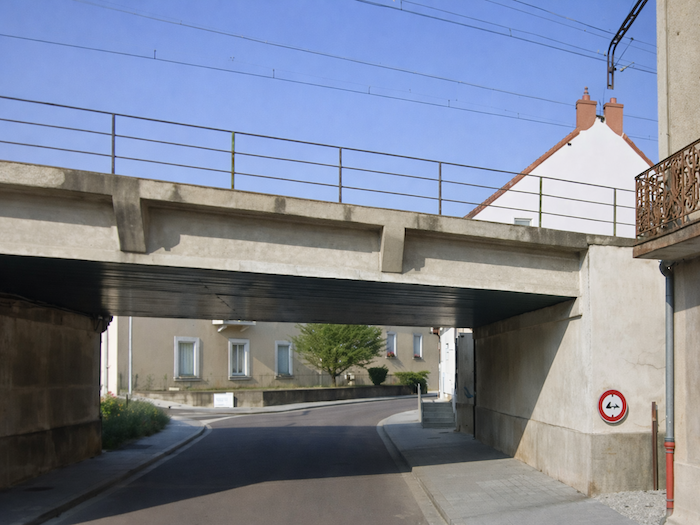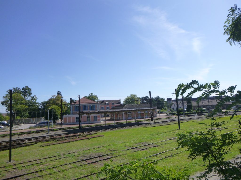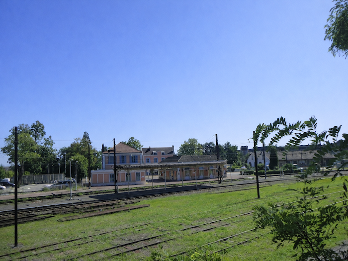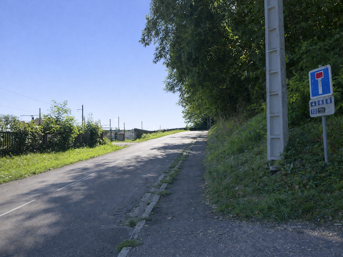 | La route, droite et résolue, traverse de nouveau la voie ferrée, puis s’élève au-dessus de la gare. D’en haut, le regard embrasse à la fois les rails qui s’allongent vers le lointain et la silhouette paisible de la petite cité. C’est un passage suspendu, comme une respiration entre deux mondes : celui de l’agitation urbaine et celui de la marche méditative. |