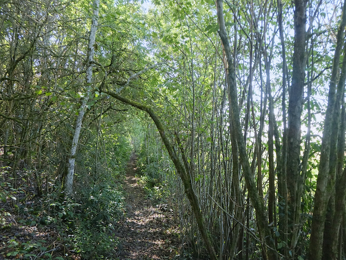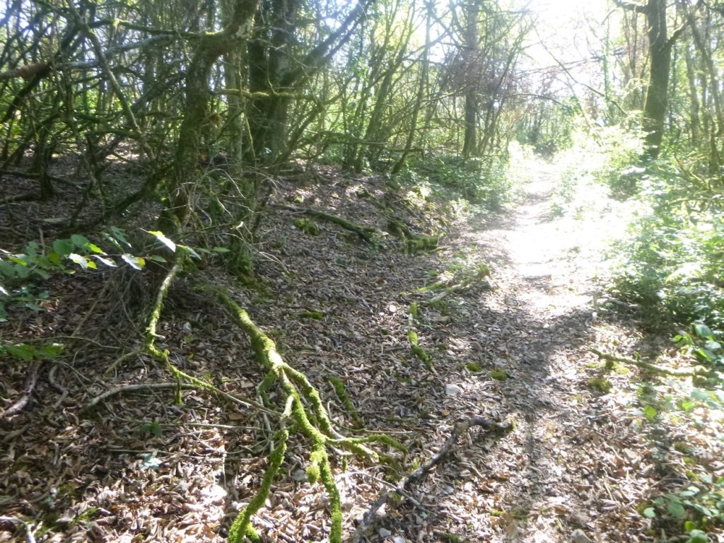 | Le chemin de Montmorin se révèle alors comme un adorable petit sentier. Il serpente avec grâce, grimpant en pente douce dans le sous-bois sauvage. On croirait qu’il danse, léger, entre les arbres, se jouant de leurs racines et de leurs ombres. |