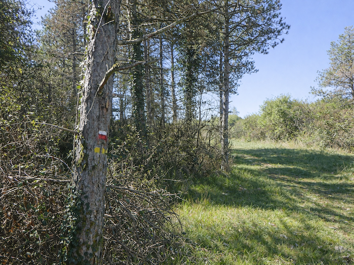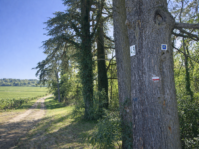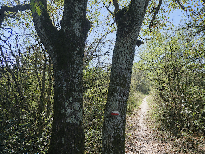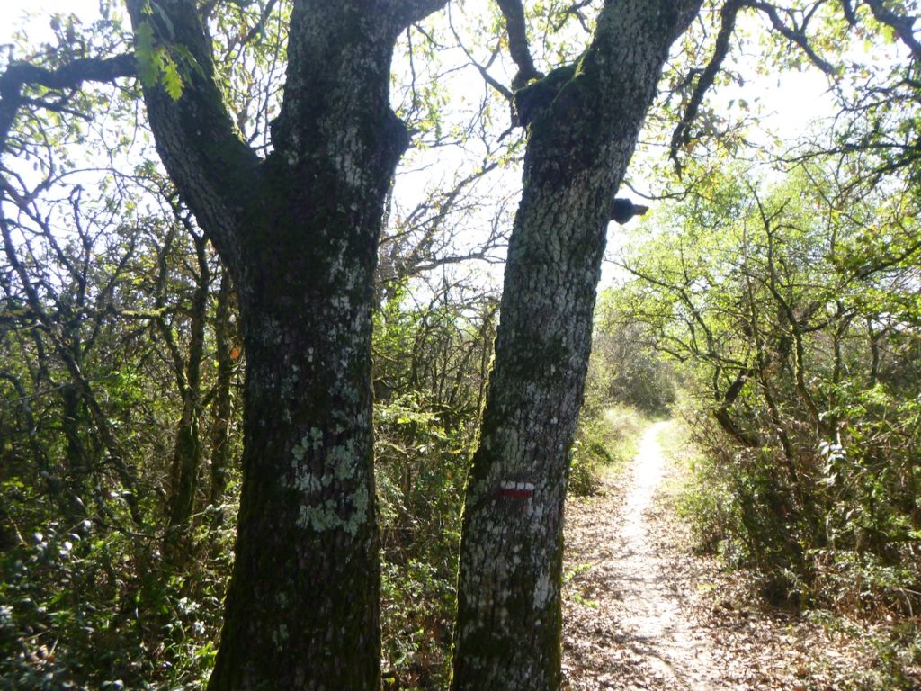| Le large chemin se déploie entre vignes et sous-bois. Les marques du parcours, coquilles bleues et bandes rouges et blanches du GR, apparaissent, plaquées sur les troncs de chênes. Ironie du sort : c’est justement ici, où nul ne risquerait de s’égarer, que l’on trouve le balisage le plus généreux, presque envahissant. Comme si la forêt elle-même voulait vous retenir, insistant sur une direction qu’elle n’a pas besoin de donner. |