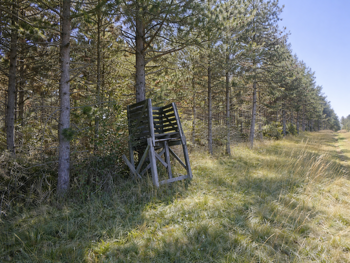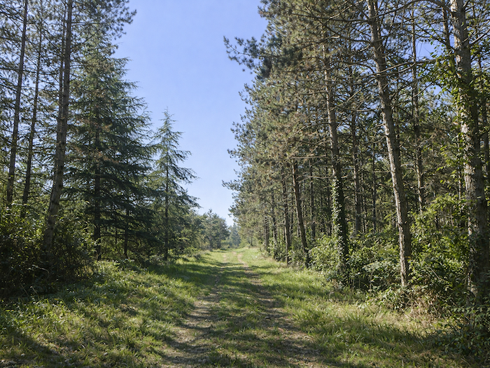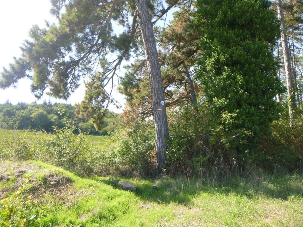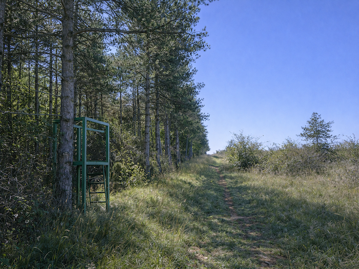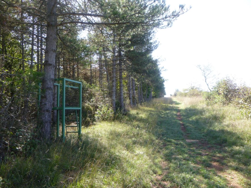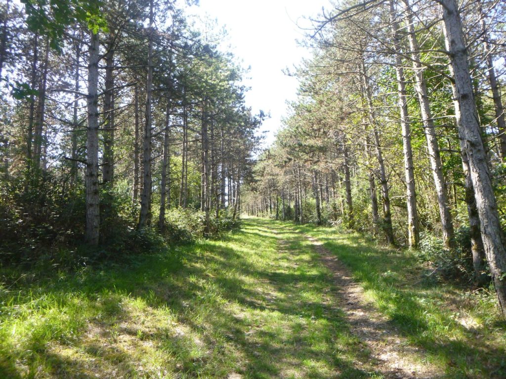 | Le chemin longe alors doucement, dans l’herbe, les rangées de pins qui s’étirent comme des sentinelles végétales. Ici, à l’automne, le pèlerin attentif pourrait surprendre le vol lourd des pigeons ramiers, ces palombes qui traversent le ciel en éclats mouvants, tandis que les chasseurs les guettent depuis leurs palombières. |