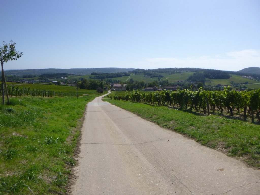 | Lorsque l’on quitte peu à peu la banlieue, la route s’allonge, longeant le vignoble comme un ruban tranquille. La circulation, loin d’être oppressante, s’écoule en douceur, et le marcheur, s’il prend soin de ses pas, peut aisément progresser sur la bande herbeuse qui borde la route, trouvant là un terrain plus souple qu’un simple trottoir. Le silence est parfois brisé par le grondement d’un moteur. |