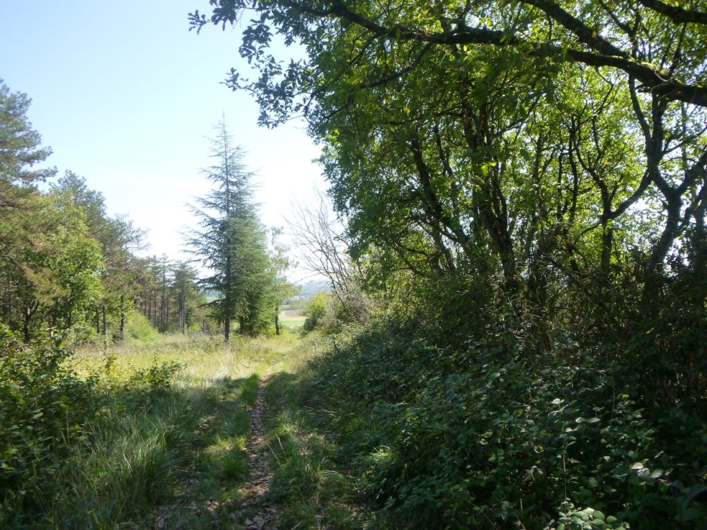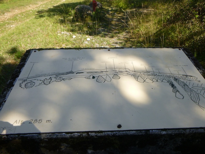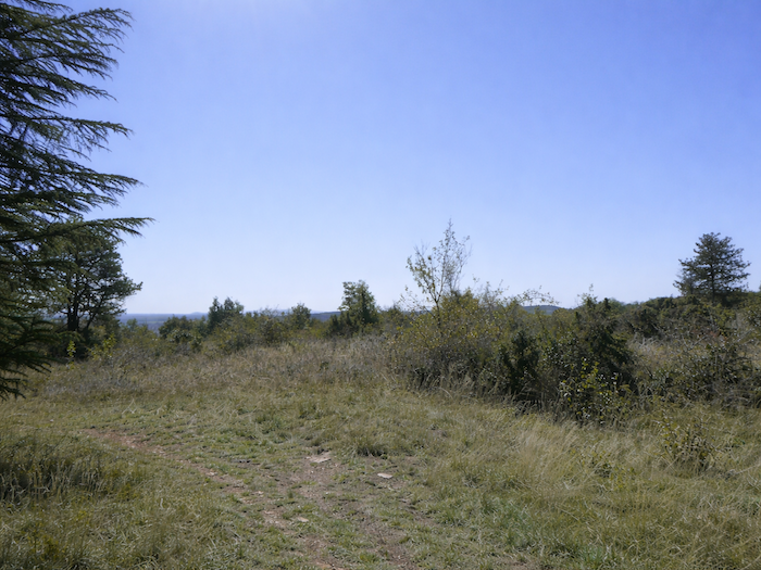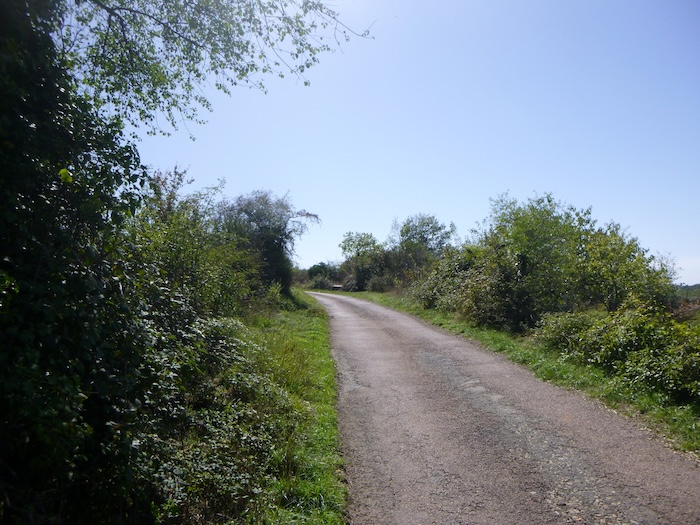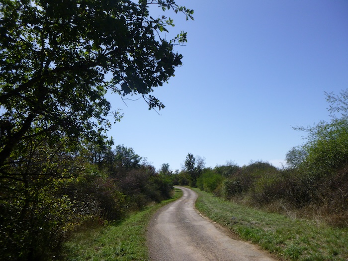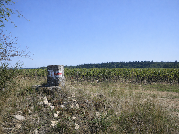 | Au niveau même du plateau, là où enfin le balisage du Chemin de Compostelle et celui du GR76 se rejoignent sans ambiguïté, le goudron s’efface. Il cède sa place à la terre battue, et avec elle, le vignoble renaît. |