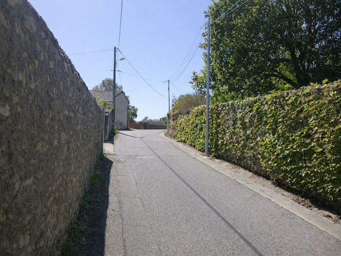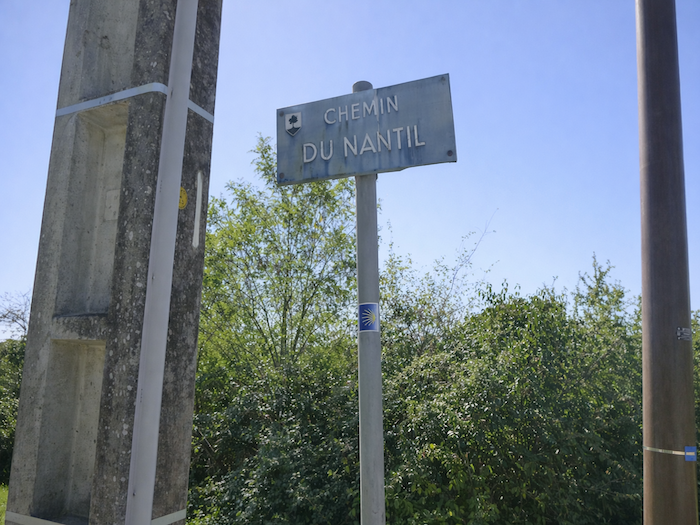 | Peu après, le parcours bifurque sur le Chemin de Nantil, où une coquille mal orientée semble vouloir égarer le marcheur distrait. Pourtant, la voie s’élève doucement, bordée de lotissements impeccablement alignés, avec leurs haies de thuyas taillées comme des murailles vertes. |