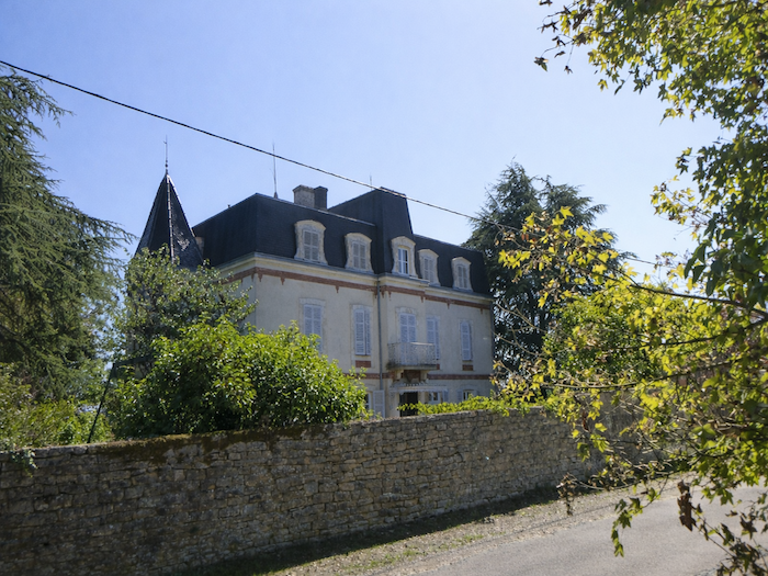 | La route passe devant une demeure élégante, blottie au cœur d’un rideau d’arbres. Les volets sont clos, l’air de sommeil enveloppe la maison, mais ce n’est pas encore le château de Rully. |