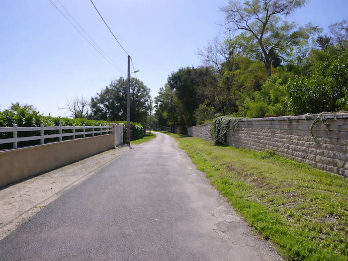 | La piste de terre battue ne tarde pas à gagner les premières maisons vigneronnes du village. |
