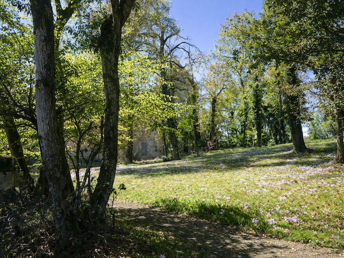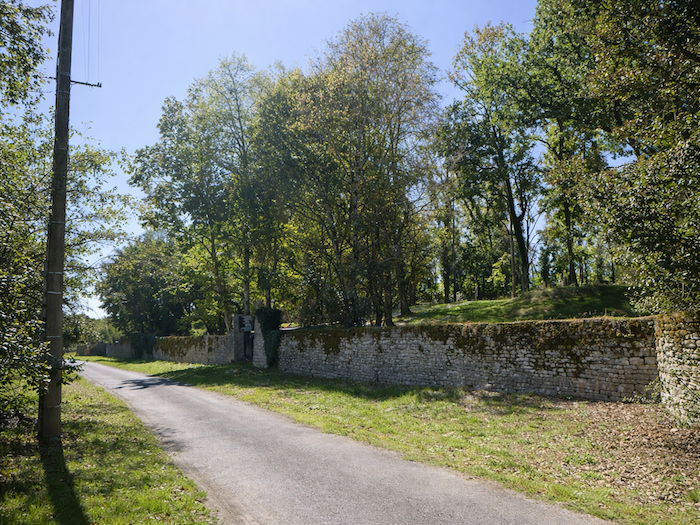 | La route longe alors le château, blotti dans un magnifique parc boisé, protégé par de hauts murs. |