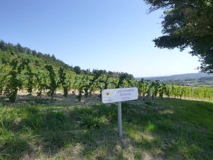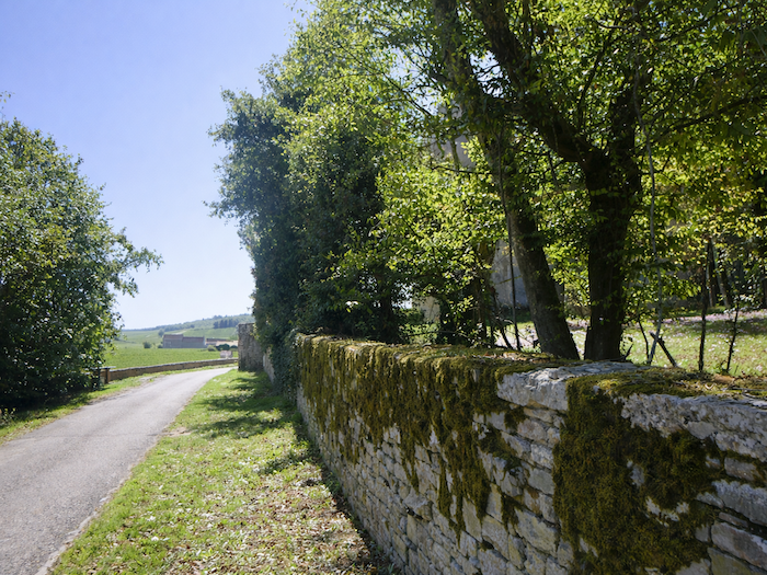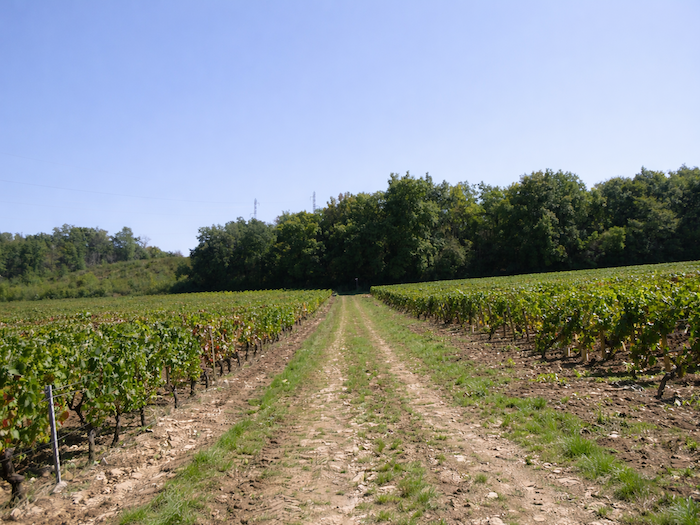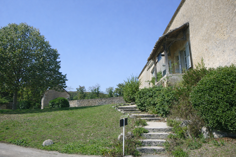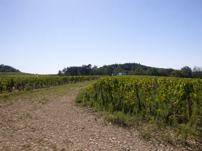 | Peu après, au sommet de la colline, apparaît le Domaine de la Folie. Vu de loin, il pourrait passer pour une ferme, mais la vérité est ailleurs : c’est un domaine viticole, car les vignes s’étendent en contrebas du bois. |